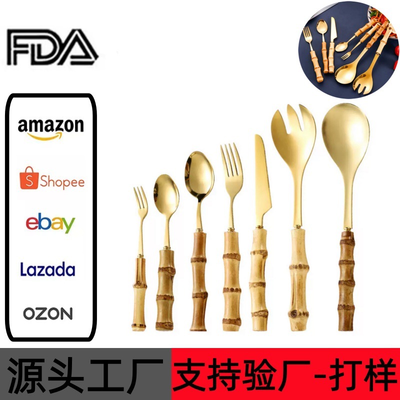 クロスボーダーステンレス天然竹祭り食器7点セットナイフフォークスプーンケーキデザートスプーンクリエイティブ木竹柄スプーン