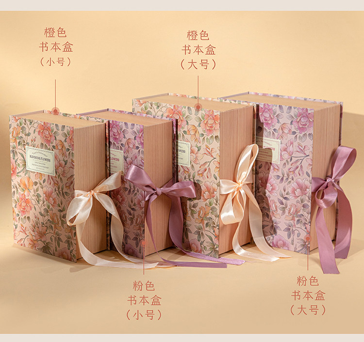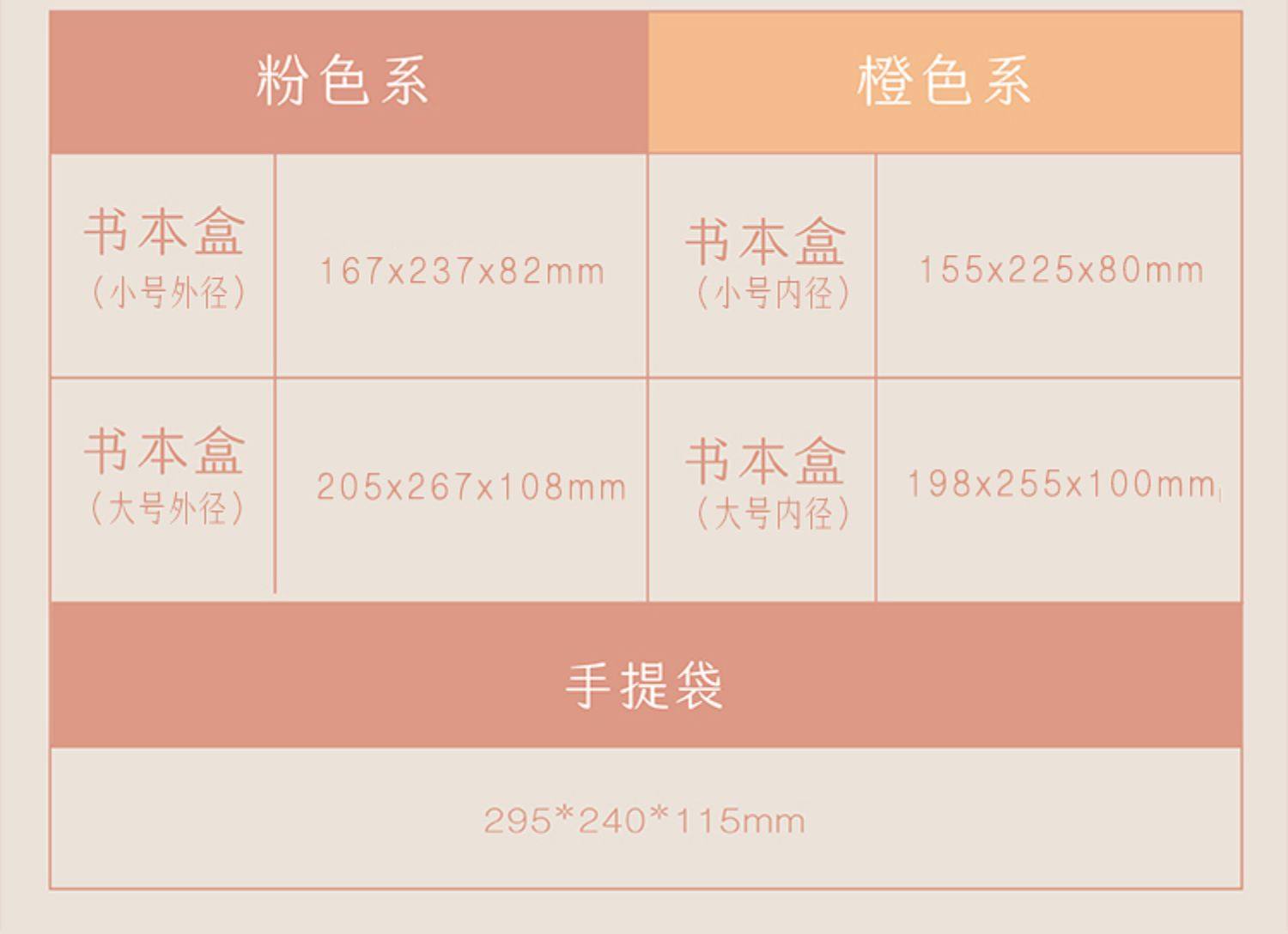 颜色 粉色书本盒小号 167*237*82mm,橙色书本盒小号 167*237*82mm,橙色书本盒大号205*267*108mm