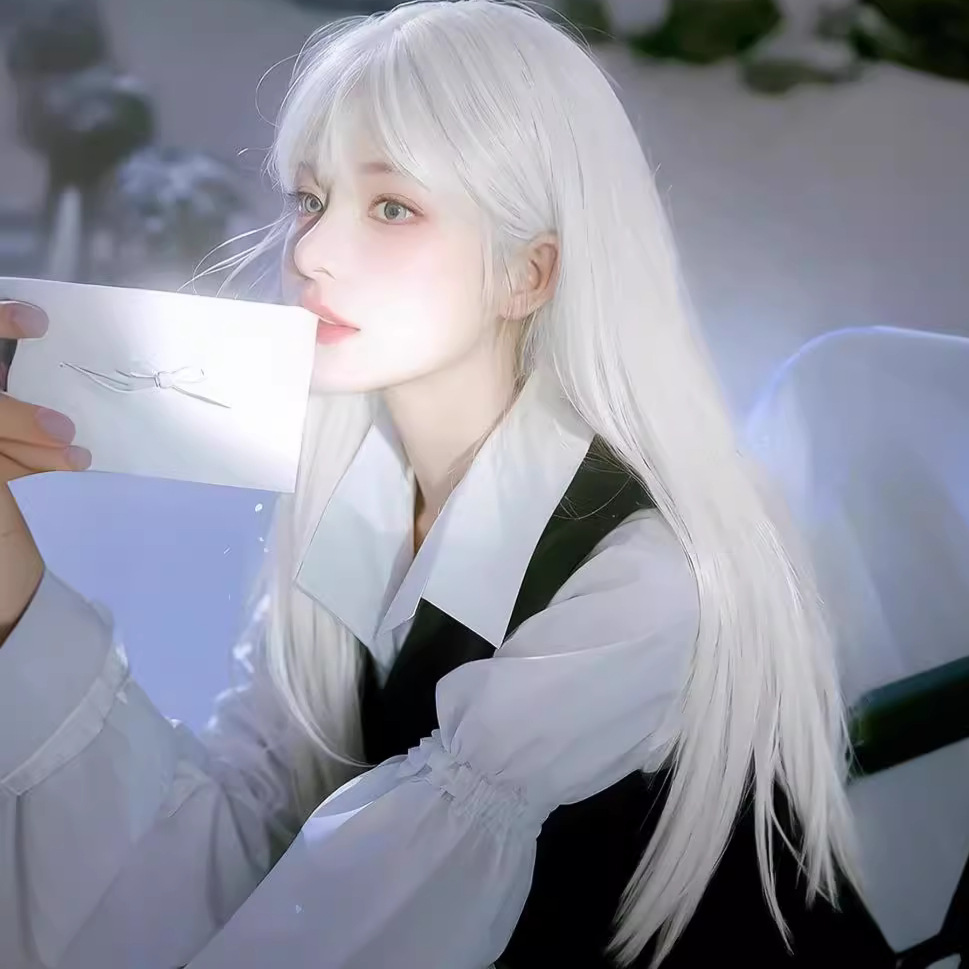 マウンテンミストブルー Ao Bing cos ロングストレートヘアミドルパートホワイトデイリーウィッグ女性の額レース調節可能なフルヘッドギア