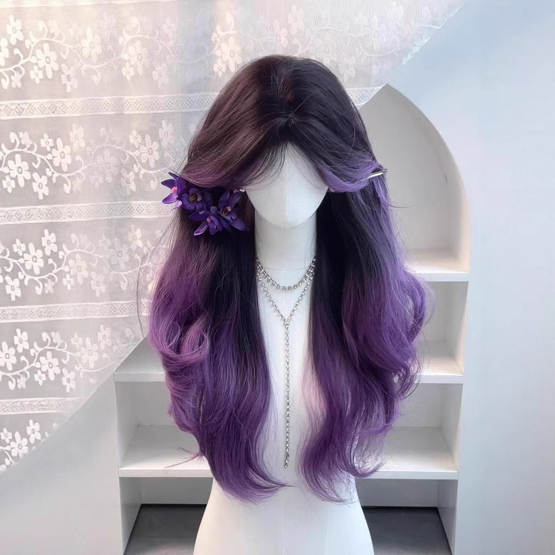 【紫色蔷薇】假发女渐变紫齐刘海长卷发氛围感大波浪自然全头套式