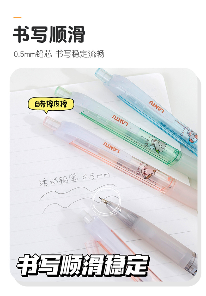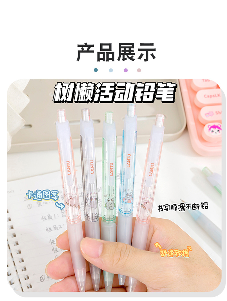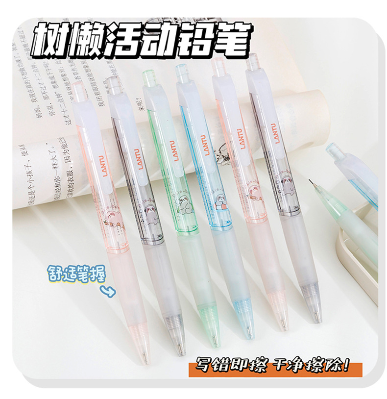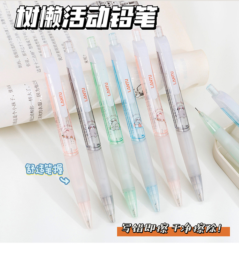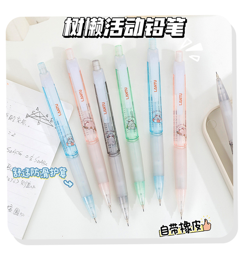 树懒透明自动铅笔不断芯简约小学生按动铅笔自带橡皮儿童活动铅笔
