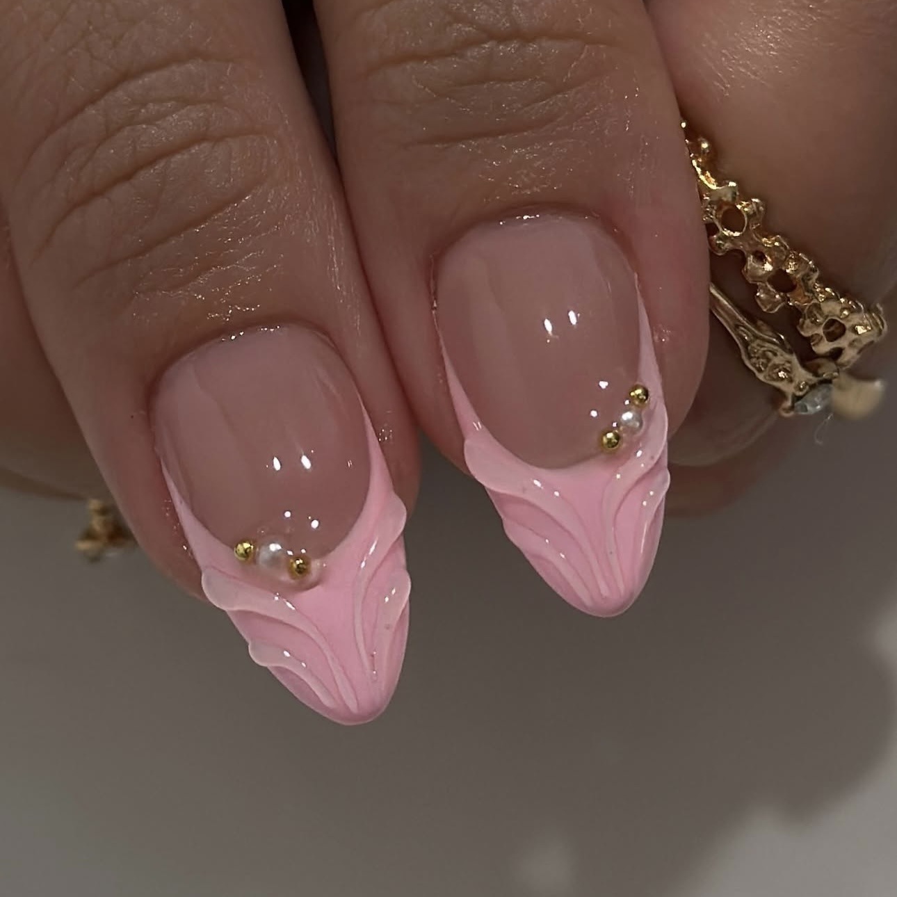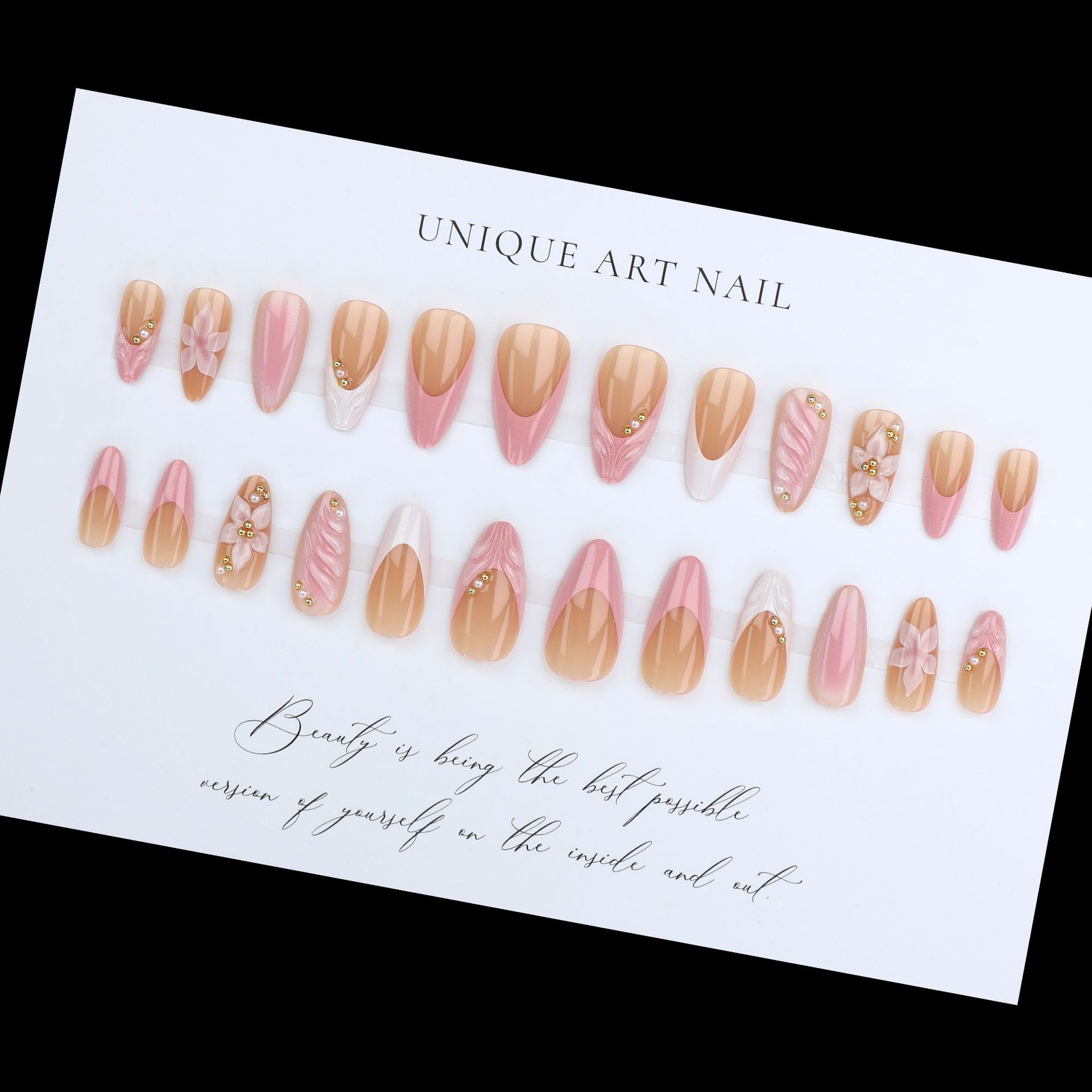 跨境热销粉色法式雕花立体穿戴甲3d花朵金珠杏仁美甲甲片工厂直发