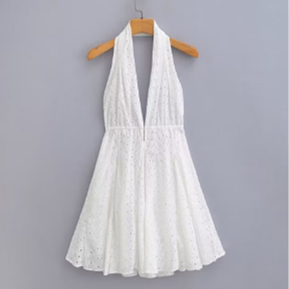 海辺のリゾートビーチスカート2023夏の優しい風ファッションvネックは腰を収めて痩せているa字の透かし彫り刺繍ワンピース
