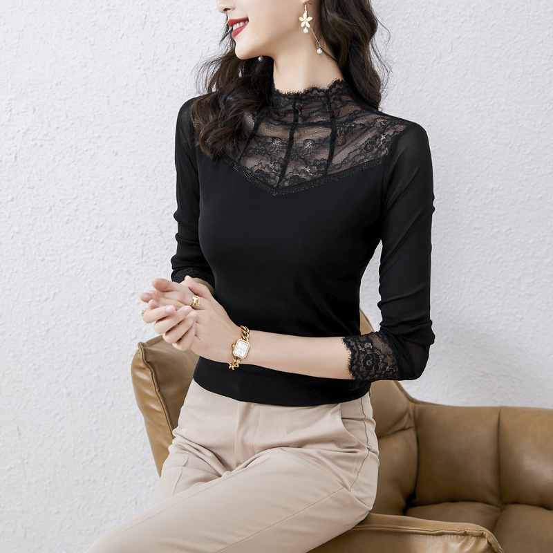 2025春の新型立襟ネットシャツの女性長袖tシャツの中にレースの上着のブラウスを着ます。