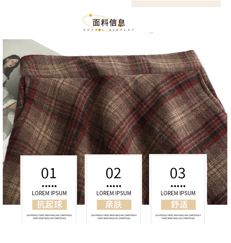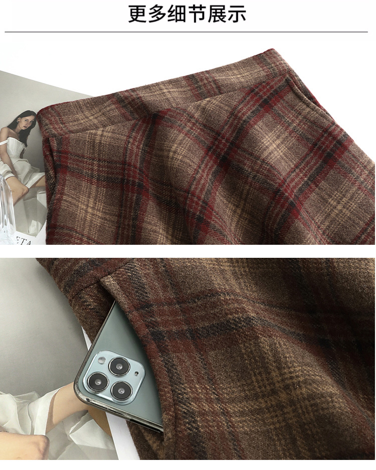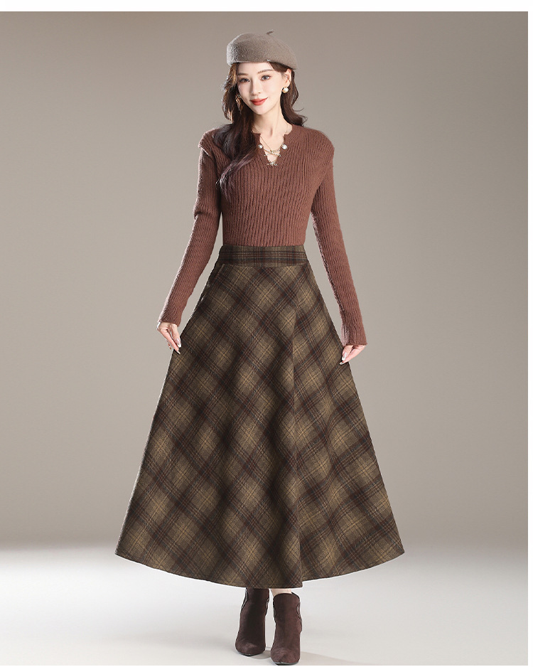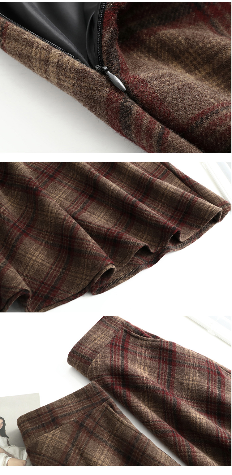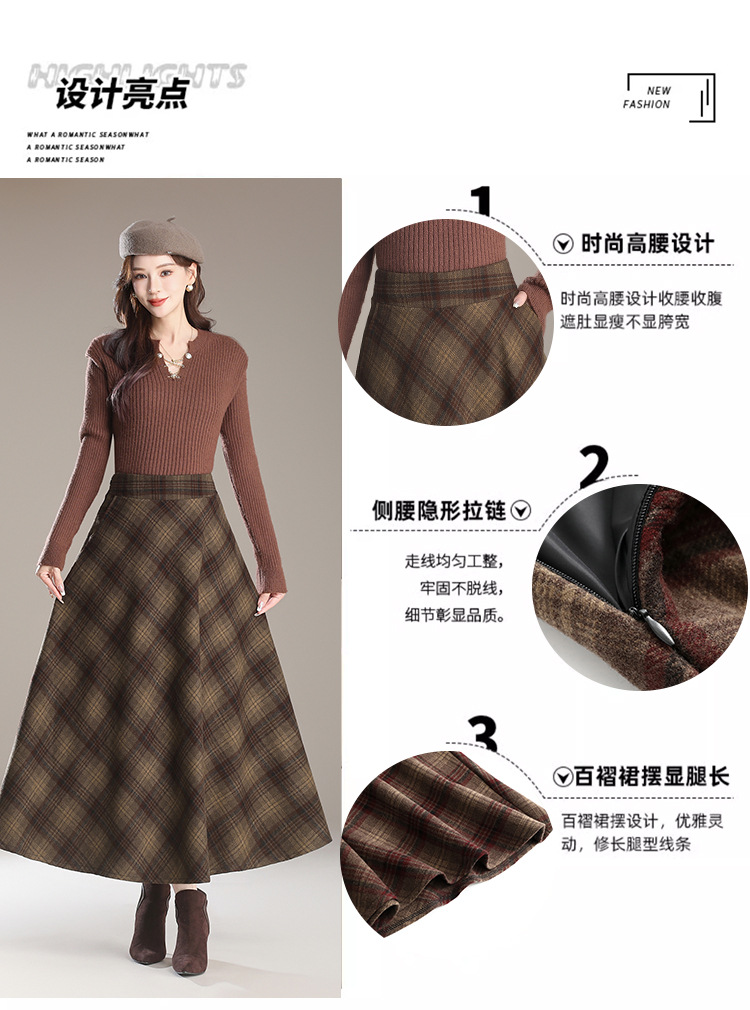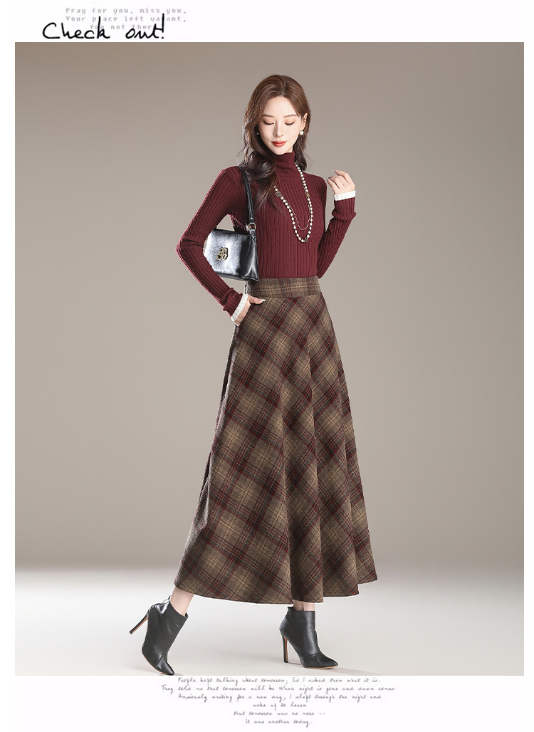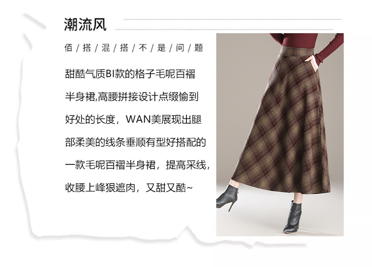 2026年秋冬韓国風中丈チェック柄ウールスカート、スリム効果のあるプリーツスカート、厚手のウール素材、大きな裾。