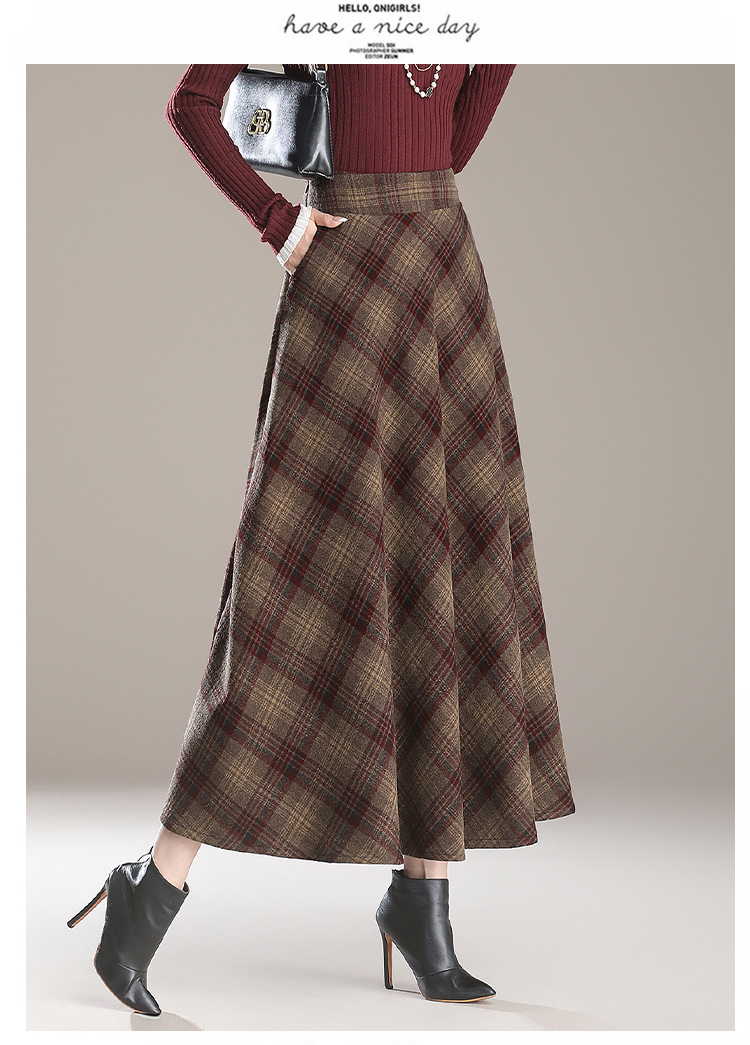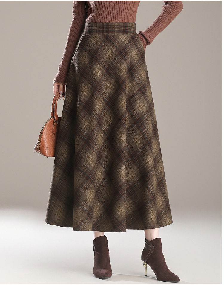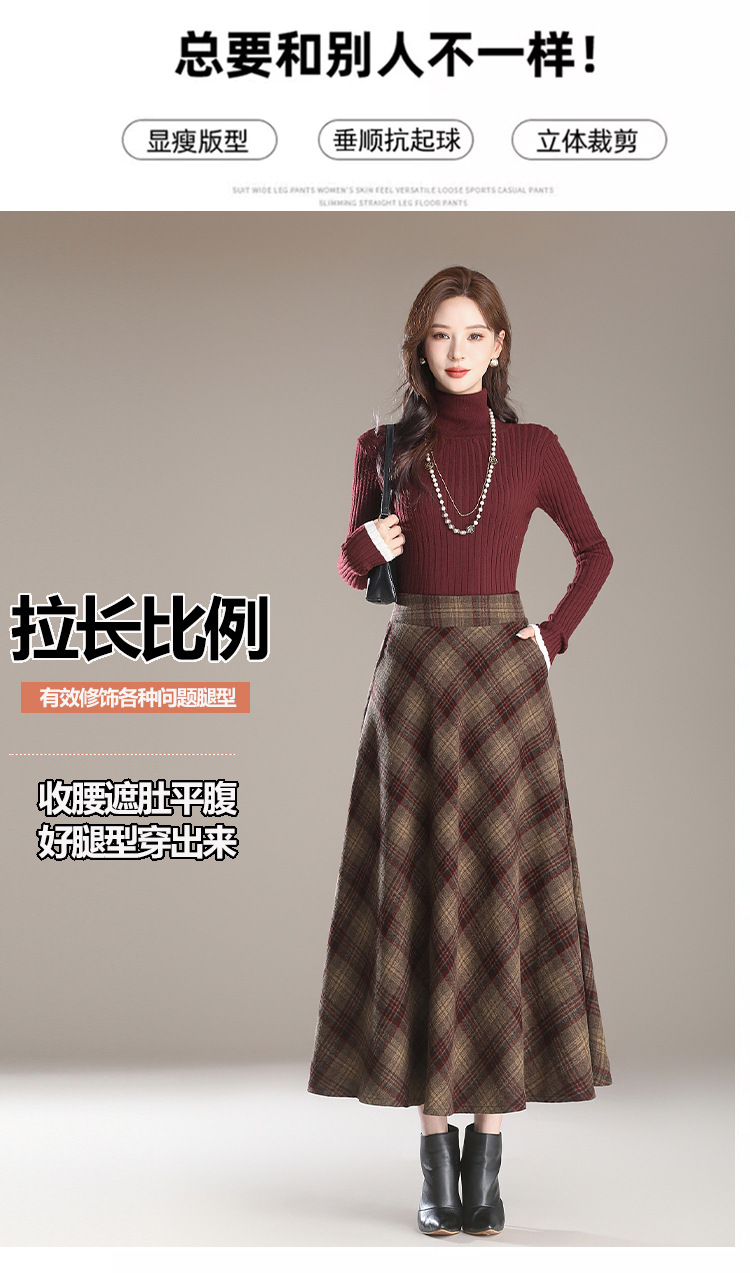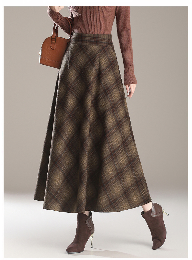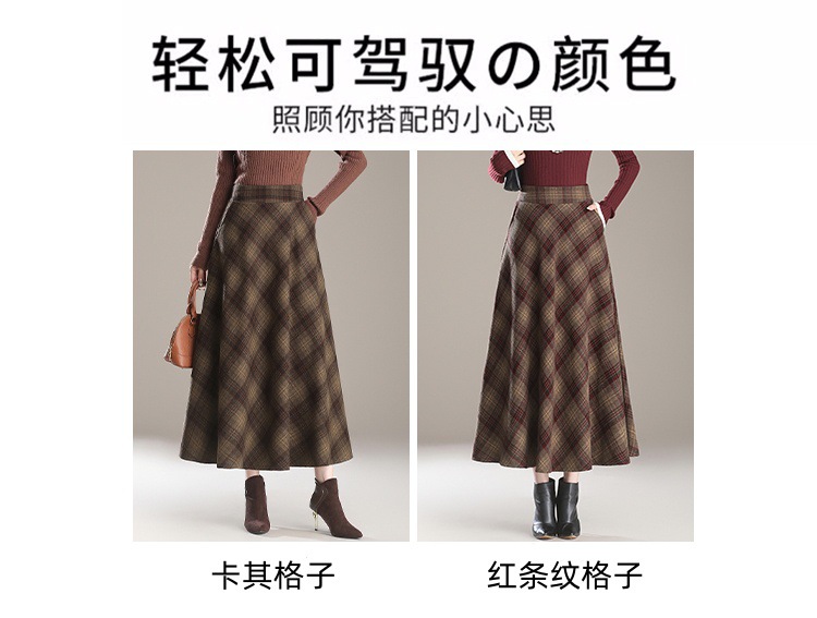2025秋冬新款毛呢格子半身裙高腰中长款显瘦大摆裙A字裙女