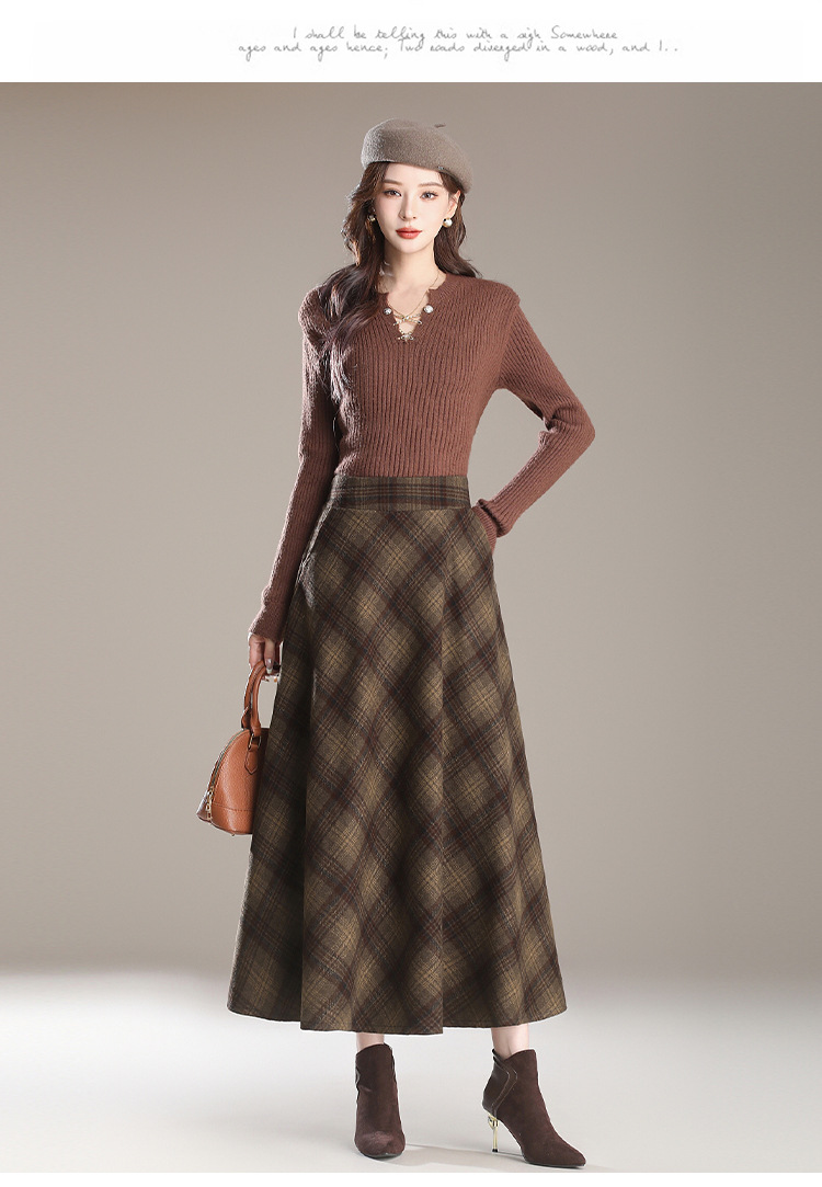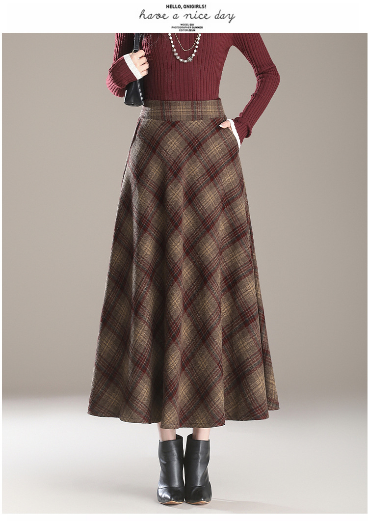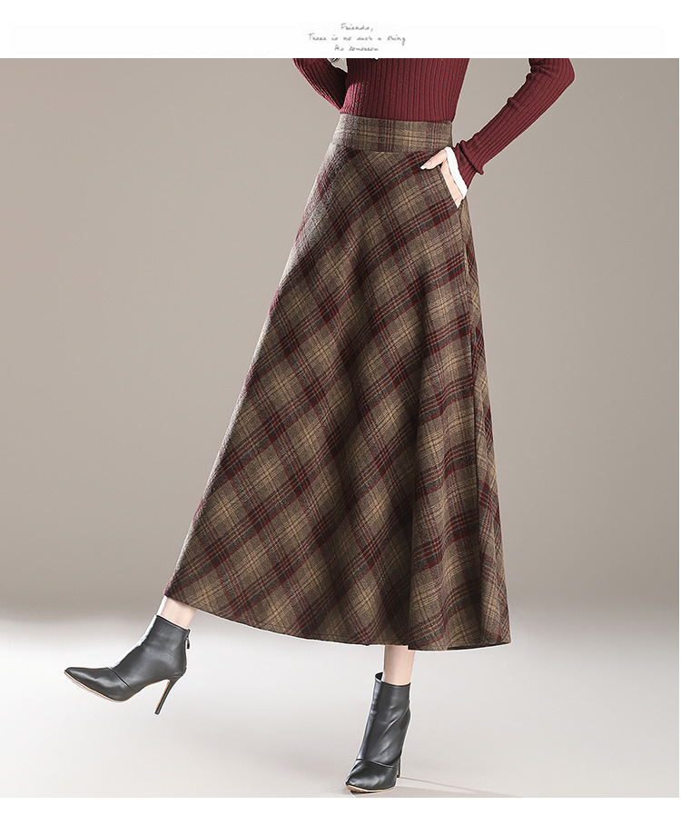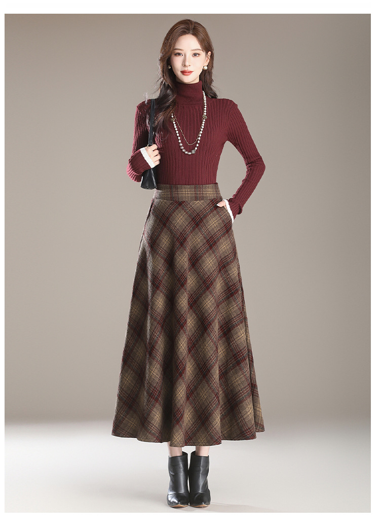 2025秋冬新款毛呢格子半身裙高腰中长款显瘦大摆裙A字裙女