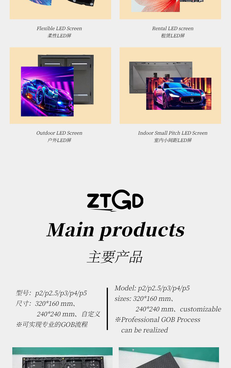 规格 P1.25模组,P1.53模组,P1.86模组,P2模组,P2.5模组,P3模组,P4模组,P10模组