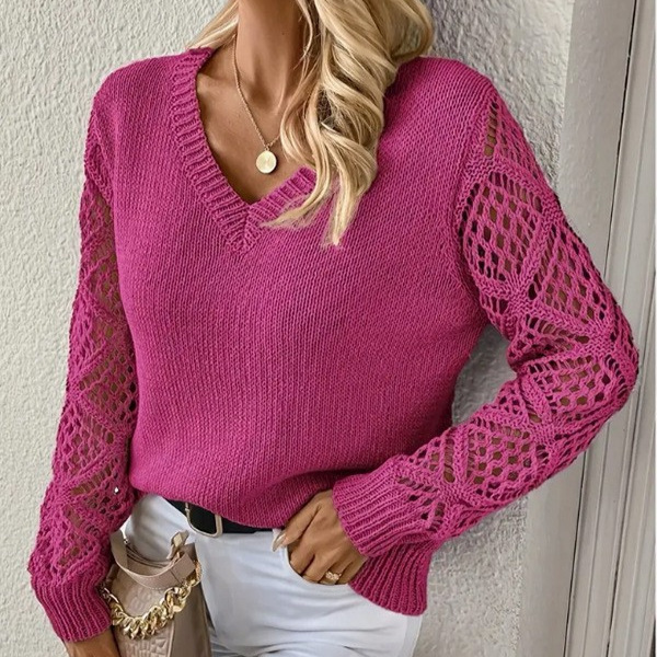 欧美外贸V领镂空针织衫套头毛衣亚马逊热卖宽松休闲百搭长袖上衣