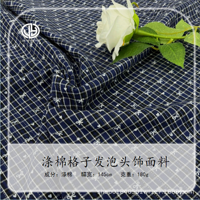 新款爆款涤棉面料格子蝴蝶结爱心印花头饰大肠圈连衣裙时装布料