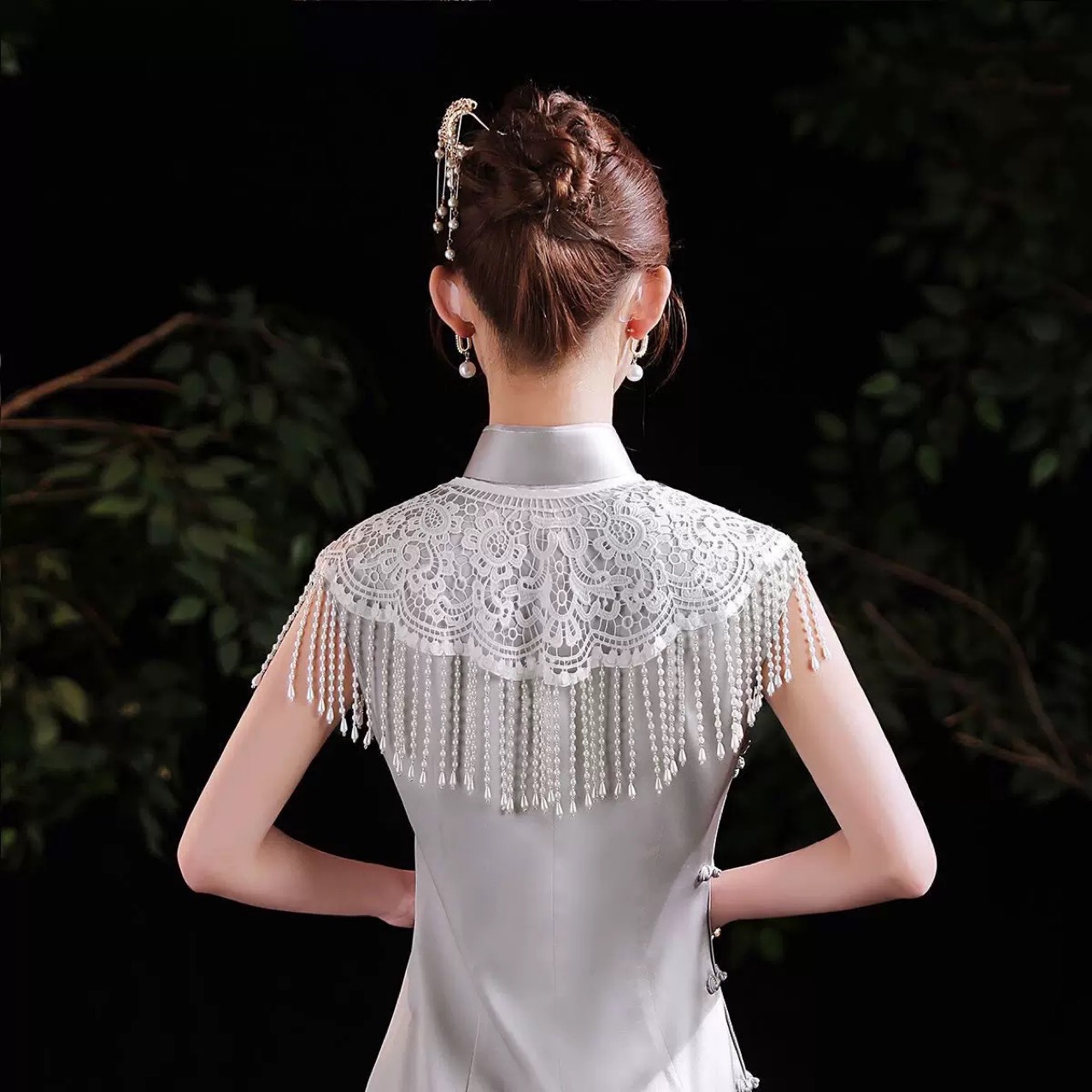 配旗袍珍珠流苏云肩披肩外搭新中式改良复古蕾丝重工年轻