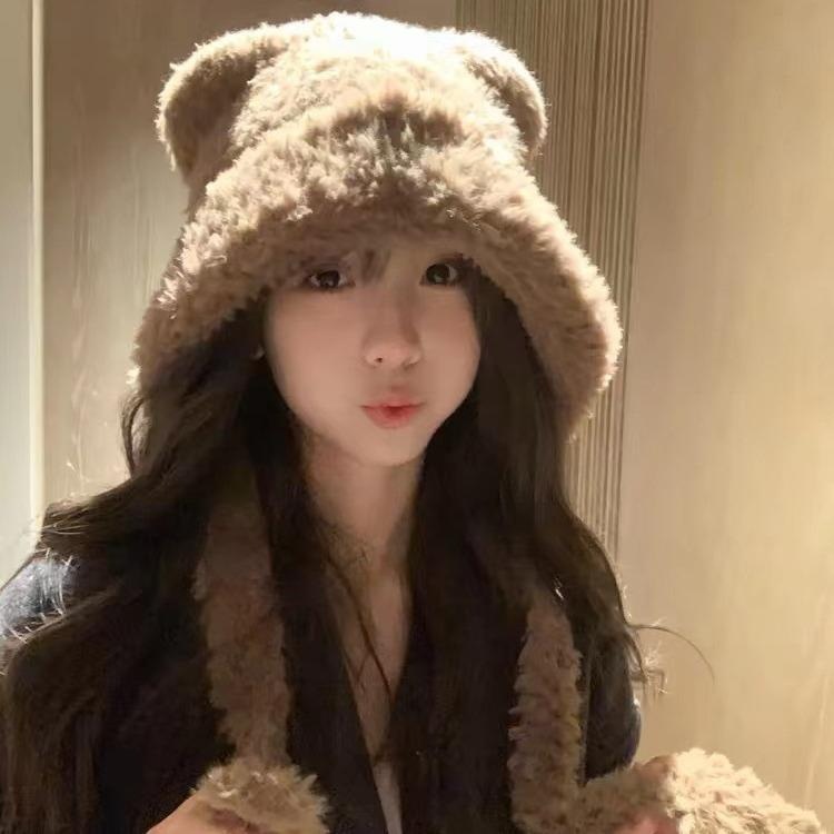 可爱小熊耳朵毛绒帽子女秋冬保暖防寒显脸小针织毛线帽护耳包头帽