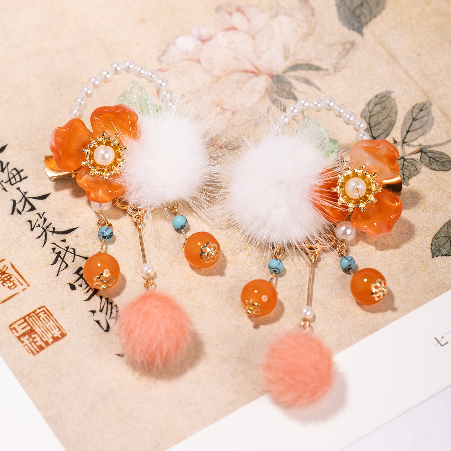 新年古风对夹喜庆中国风汉服女童水貂毛球发夹过年流苏汉服发饰
