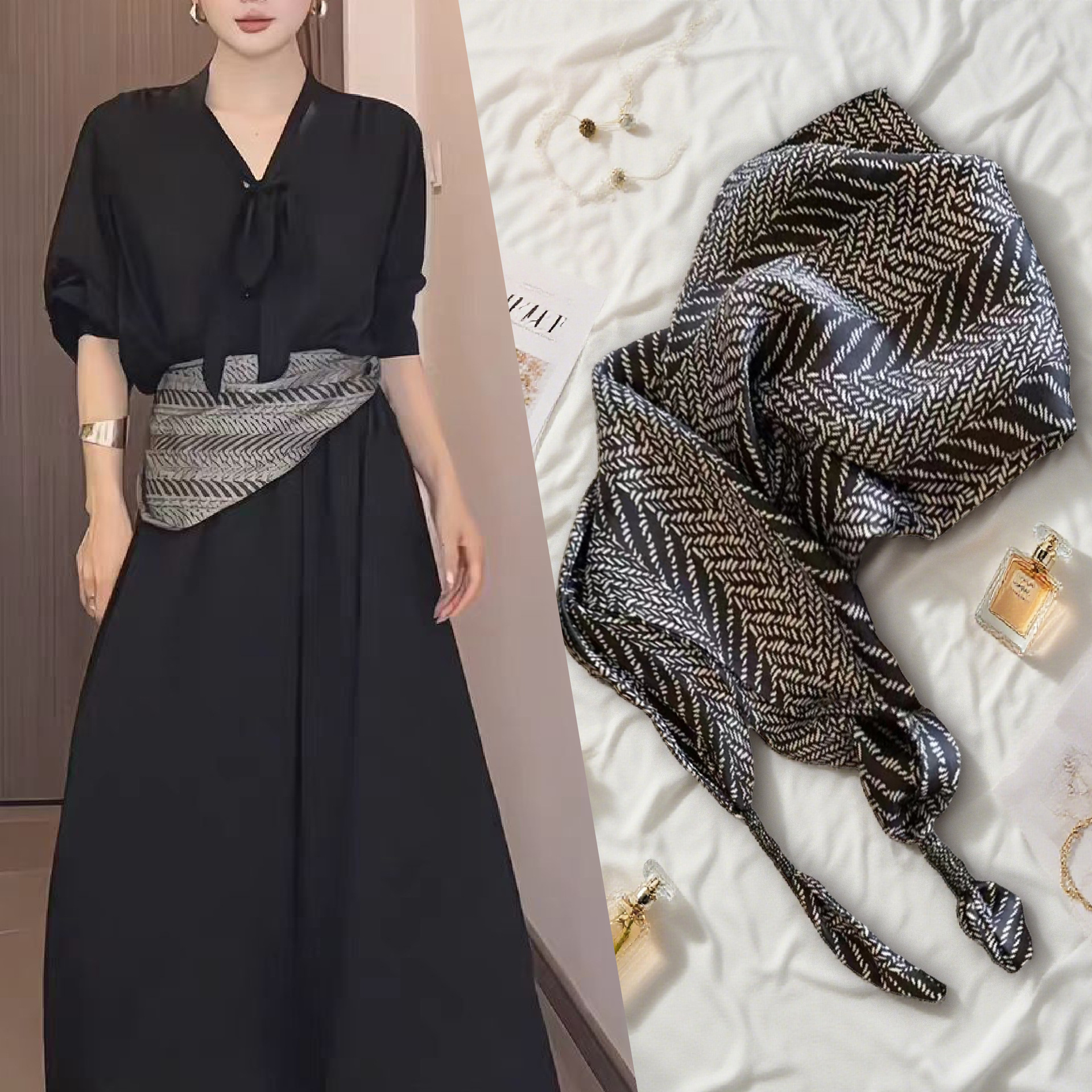 轻奢黑色条纹系腰三角巾屁帘2025新款丝巾腰带高级感腰间配饰腰巾