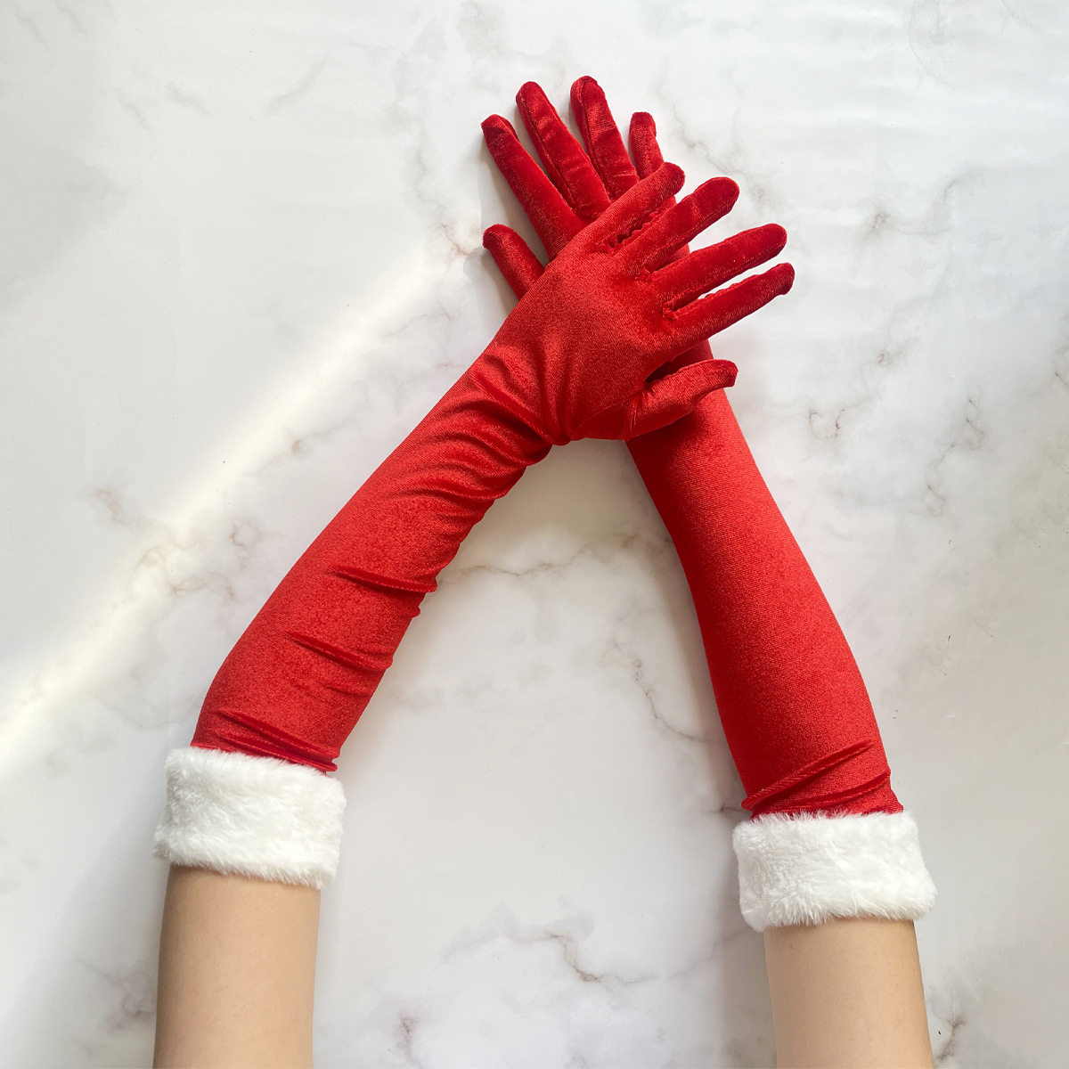 欧美跨境新款圣诞节手套55长天鹅绒毛口红色圣诞手套绒手套派对
