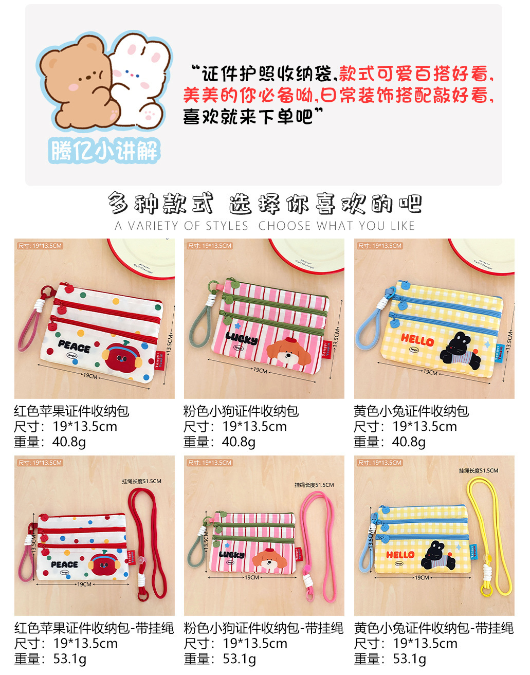 颜色 1#红色苹果证件收纳包,2#粉色小狗证件收纳包,3#黄色小兔证件收纳包,4#红色苹果证件收纳包—带挂绳,5#粉色小狗证件收纳包—带挂绳