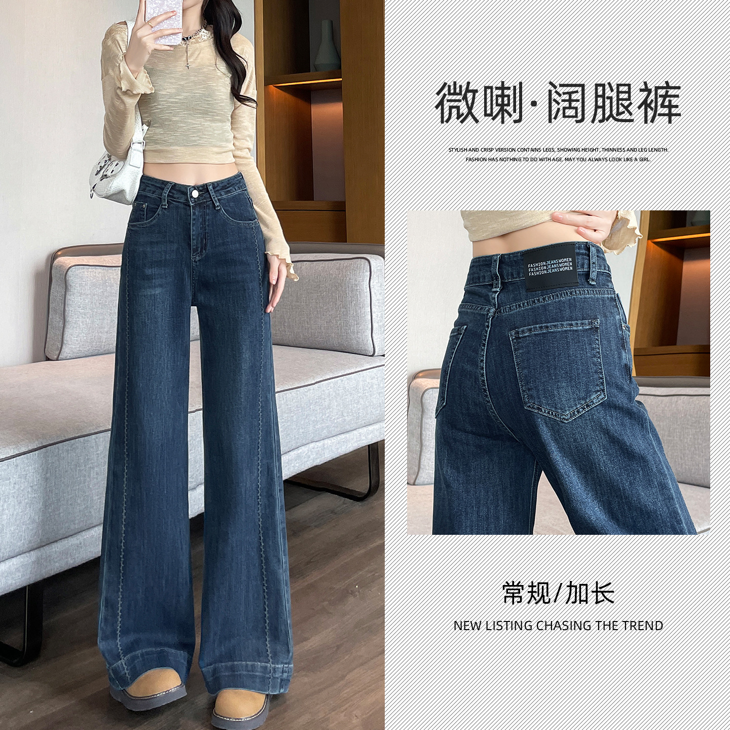 今年超火拼接弹力喇叭牛仔裤女秋季2025新款高腰宽松遮腿型阔腿裤