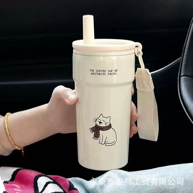 新款高颜值女生保温杯卡通小猫吸管水杯子便携水杯男咖啡杯直饮杯