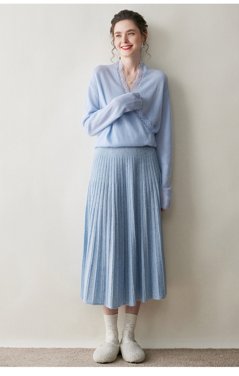 韩系简约百搭时尚纯色山羊绒女针织半身裙百褶裙宽松休闲松紧腰