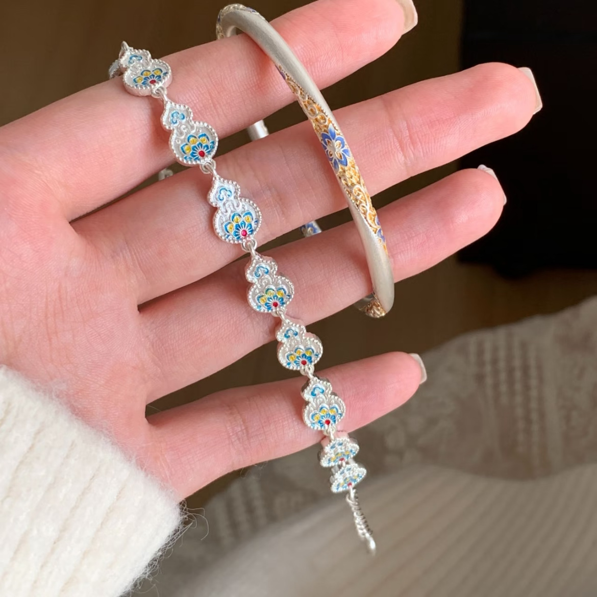 国风珐琅彩足银999 汉服手链新中式小众女生葫芦滴油祥云个性描金