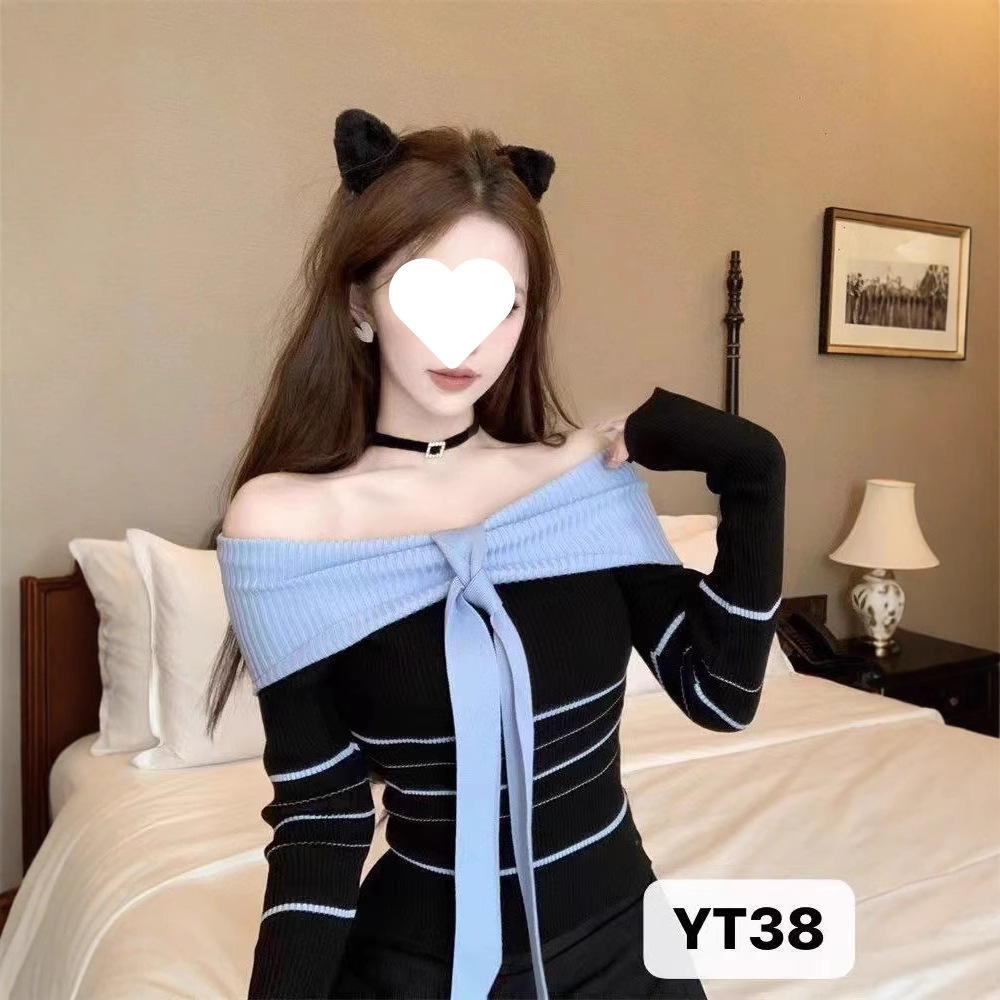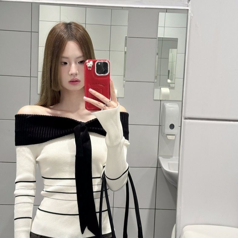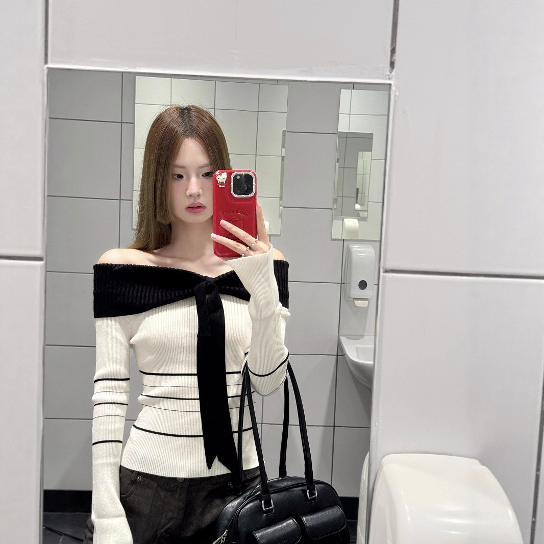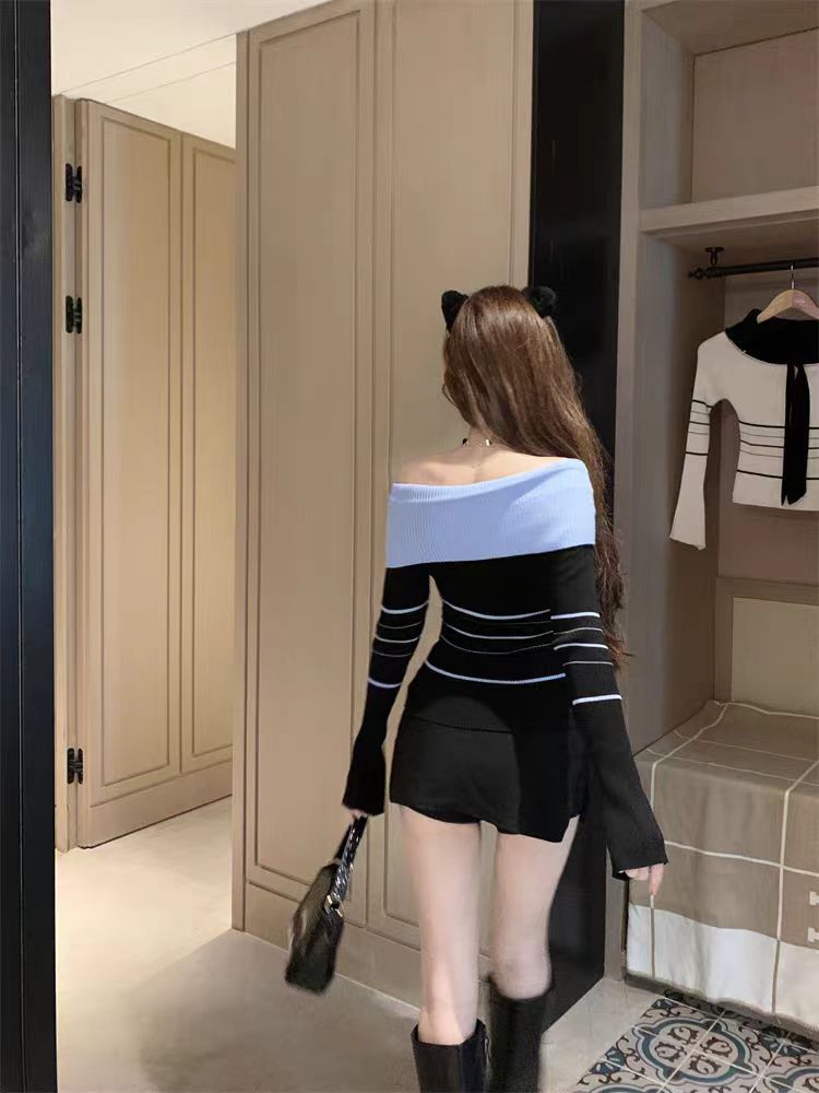 山力达迪气质设计感撞色条纹一字肩毛衣针织衫女秋冬小众修身短款