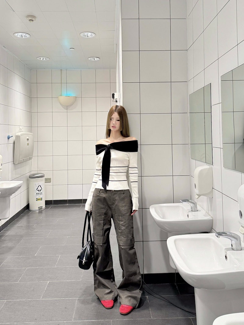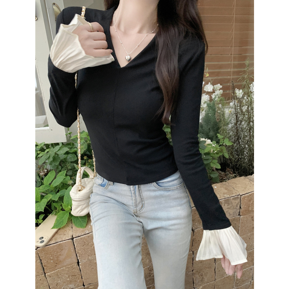 708 # # # 実写1*1ねじ270g 2024秋冬服vネックシャツ女性レースはトランペット袖をつなぎ合わせた