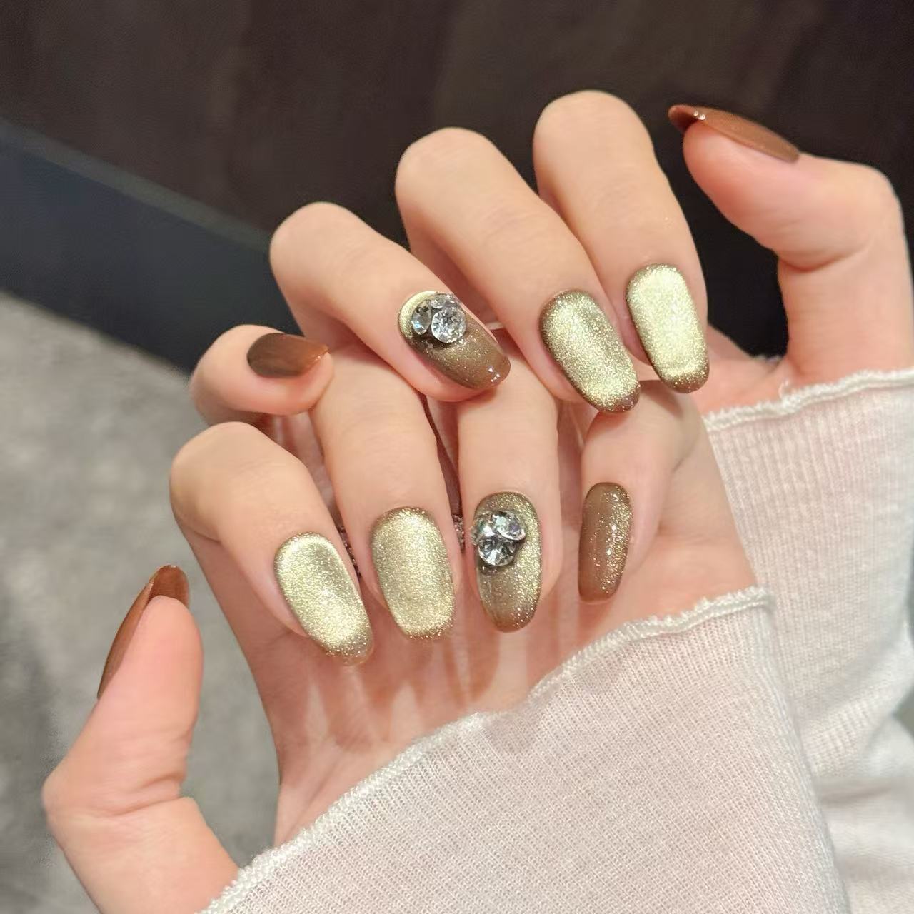纯手工穿戴甲香槟爆闪猫眼焦糖琥珀秋冬显白假指甲美甲片成品批发