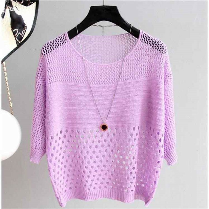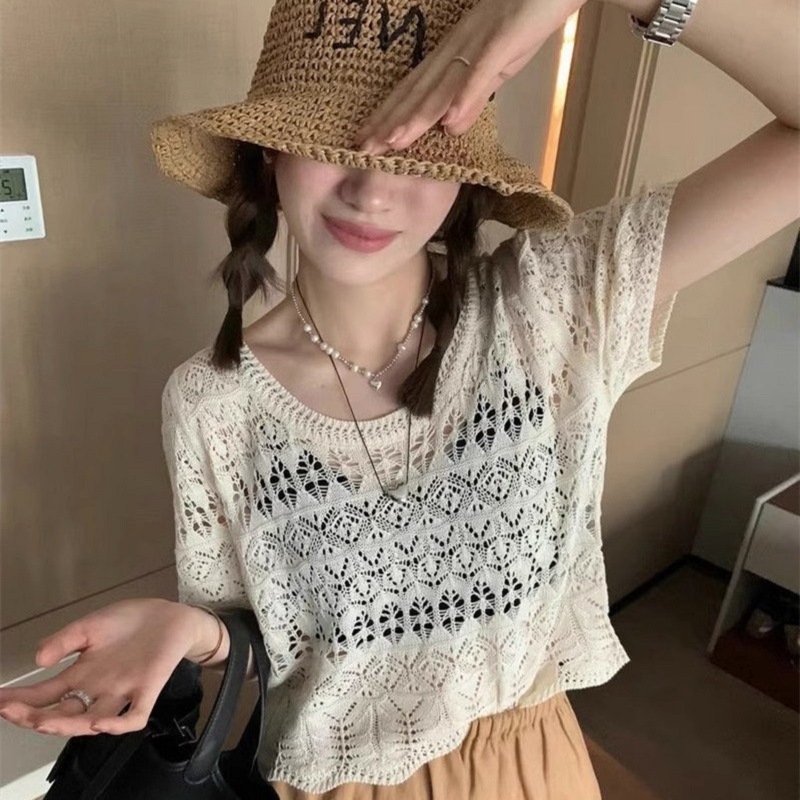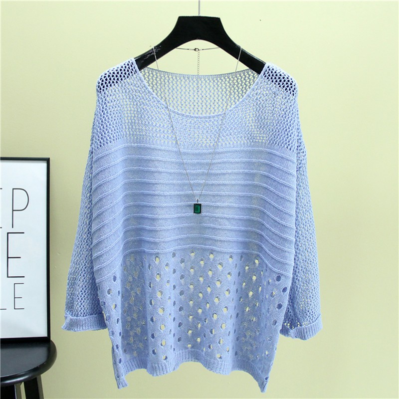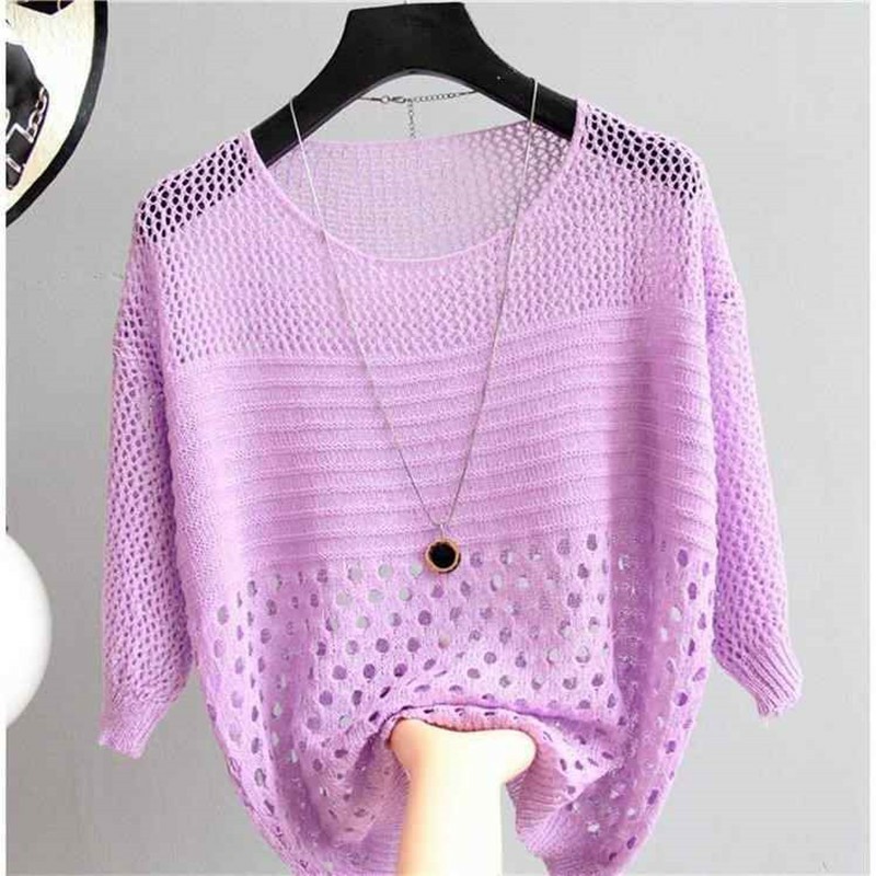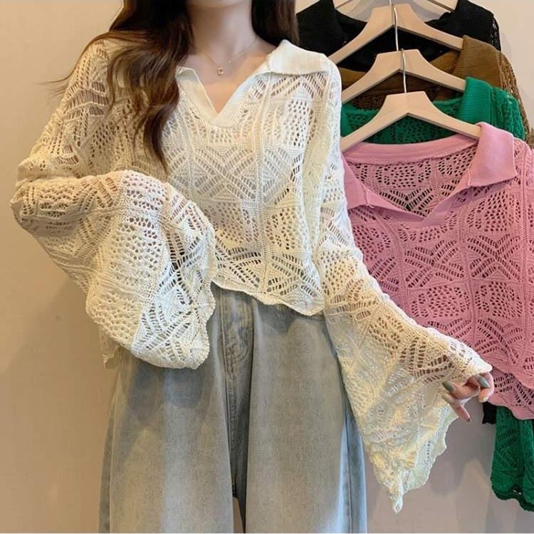 夏用薄手ゆったりラウンドネックレディース新作大きいサイズ透かし編みニット日焼け止めブラウストップス流行