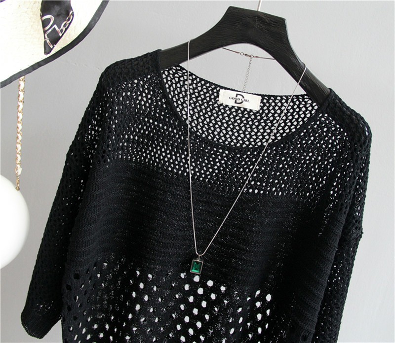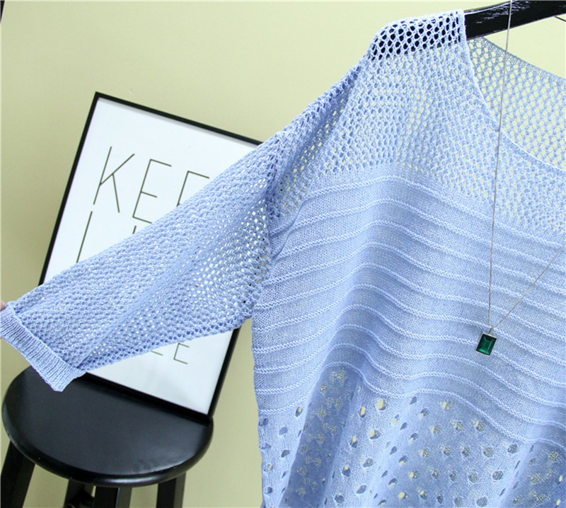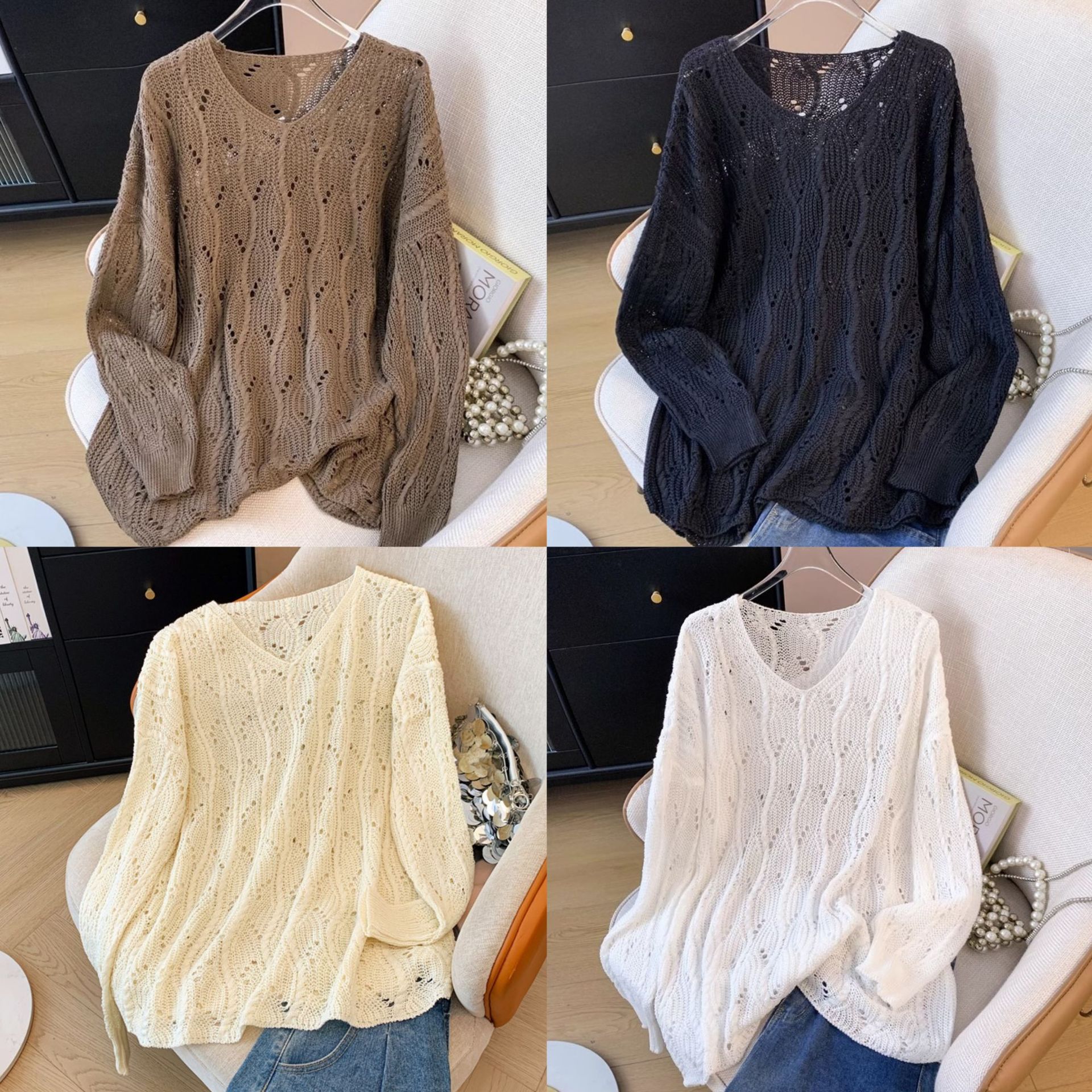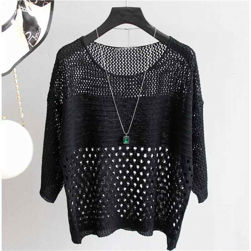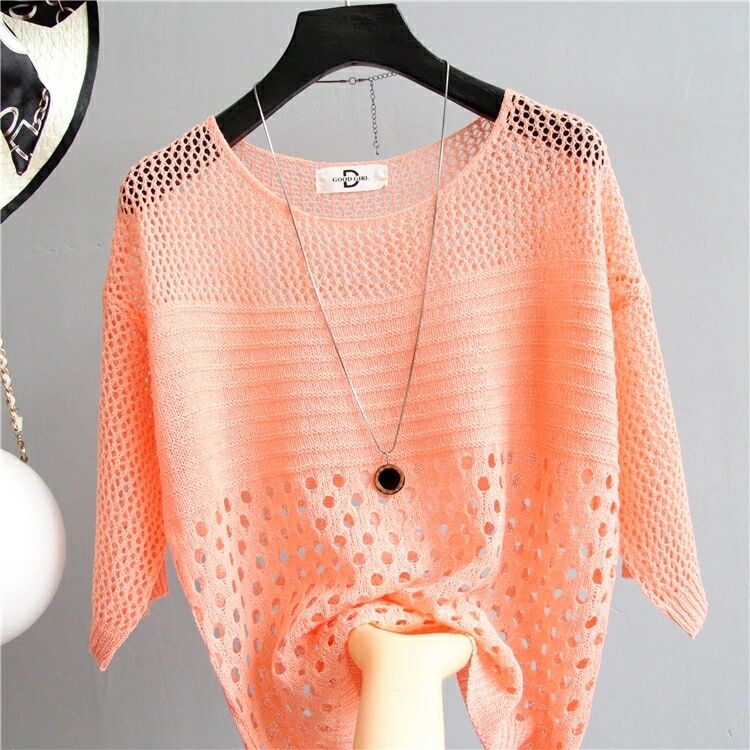 夏用薄手ゆったりラウンドネックレディース新作大きいサイズ透かし編みニット日焼け止めブラウストップス流行