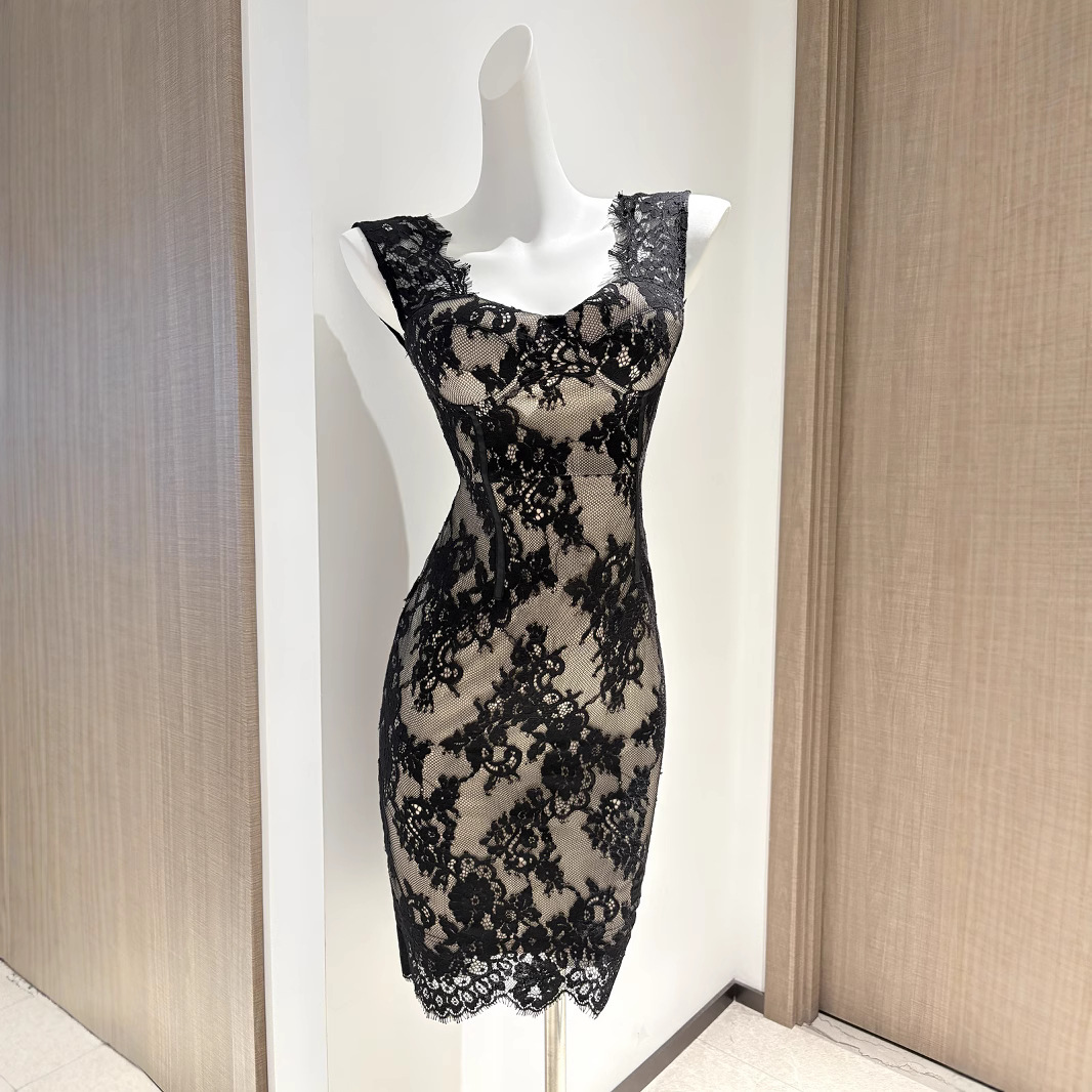 スリムでエレガントな黒と白のレースドレス、タイトフィットヒップスカートドレス、包帯スカート