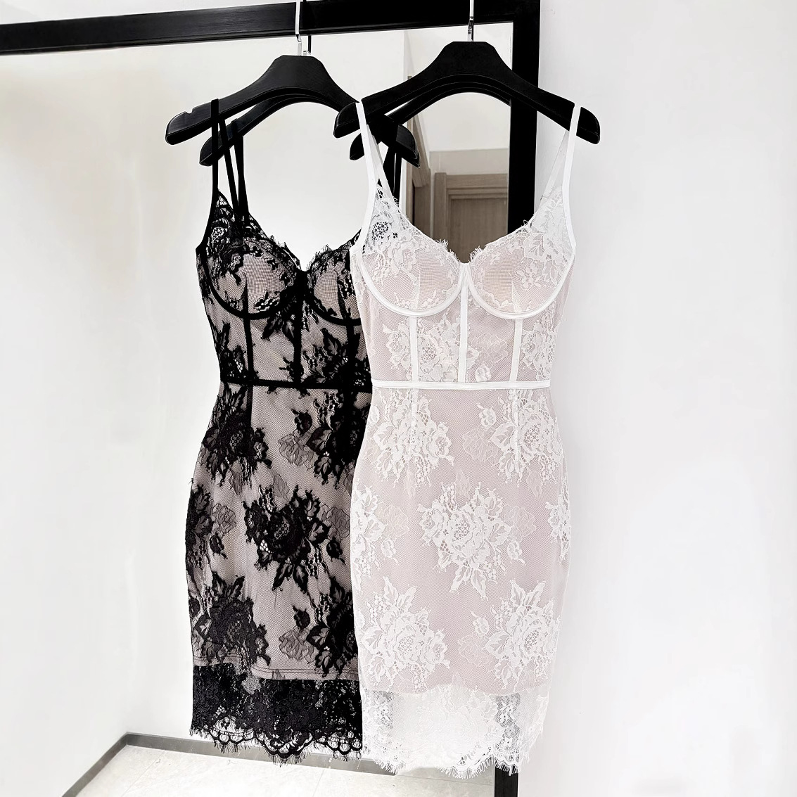 セクシーなレースウエストレースサスペンダーVネック胸パッドドレスレーススカート