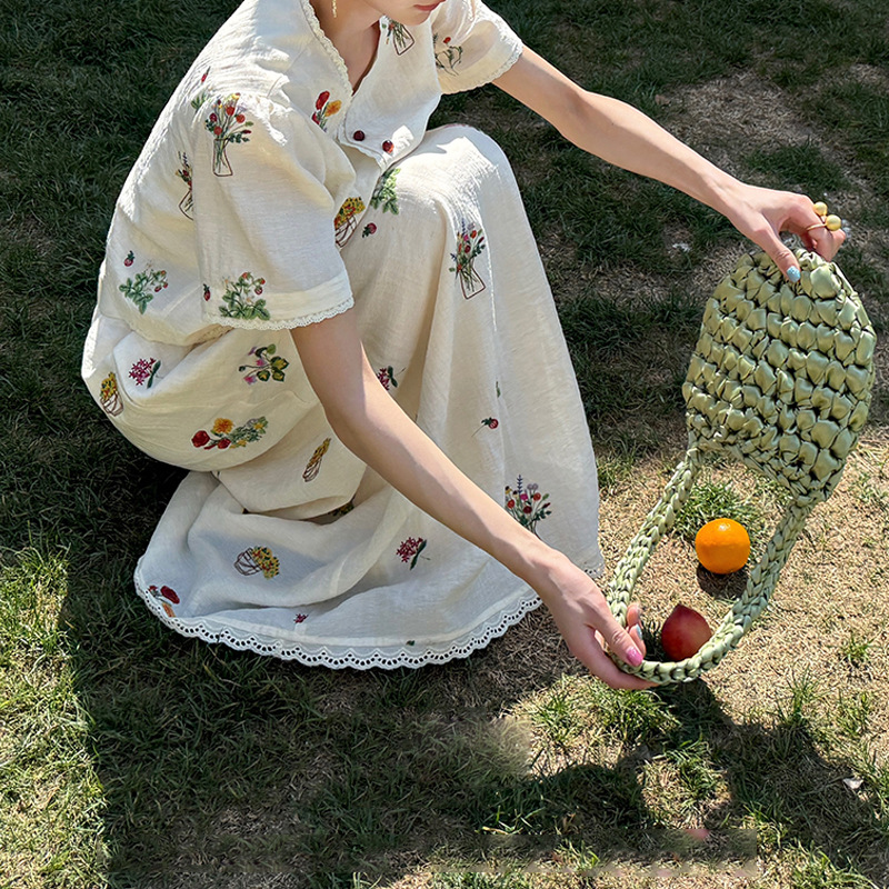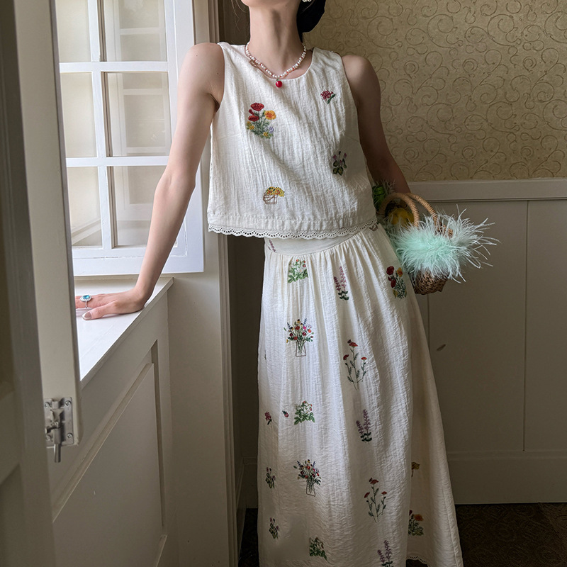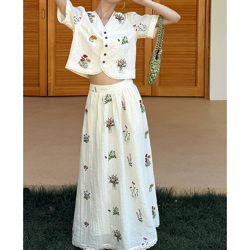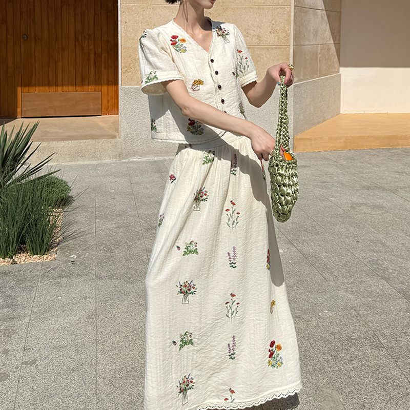 【事事幽】亚麻重工绣花短袖T恤女夏慵懒风半身裙套装OOTD一整套