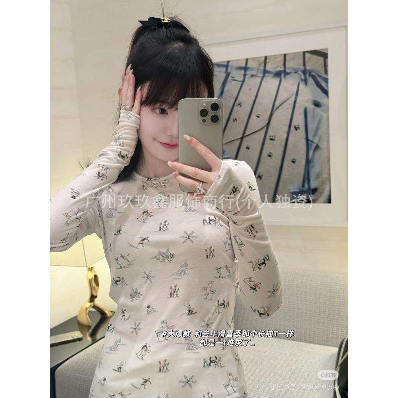 H小香风25早春新款满身印花蝴蝶结装饰圆领上衣打底长袖T
