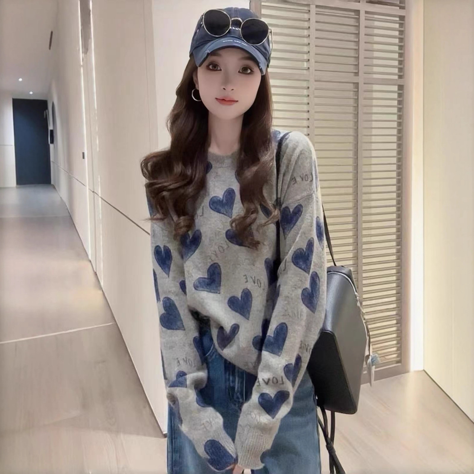 哥家商场同款女装2025秋季时尚减龄圆领慵懒风宽松爱心字母毛衣