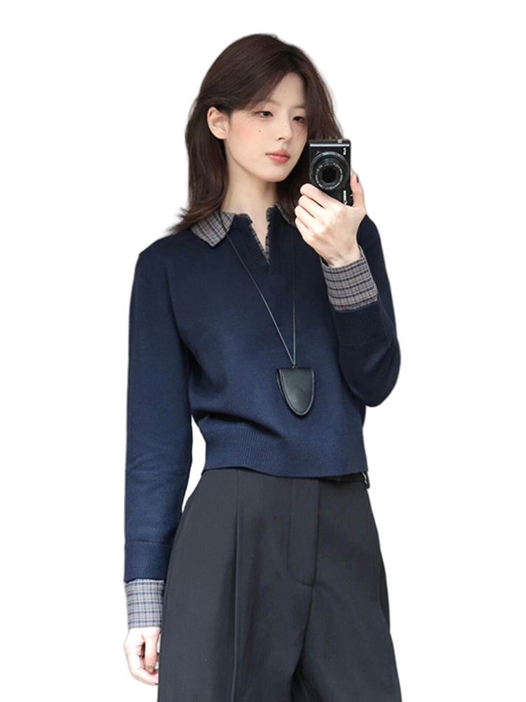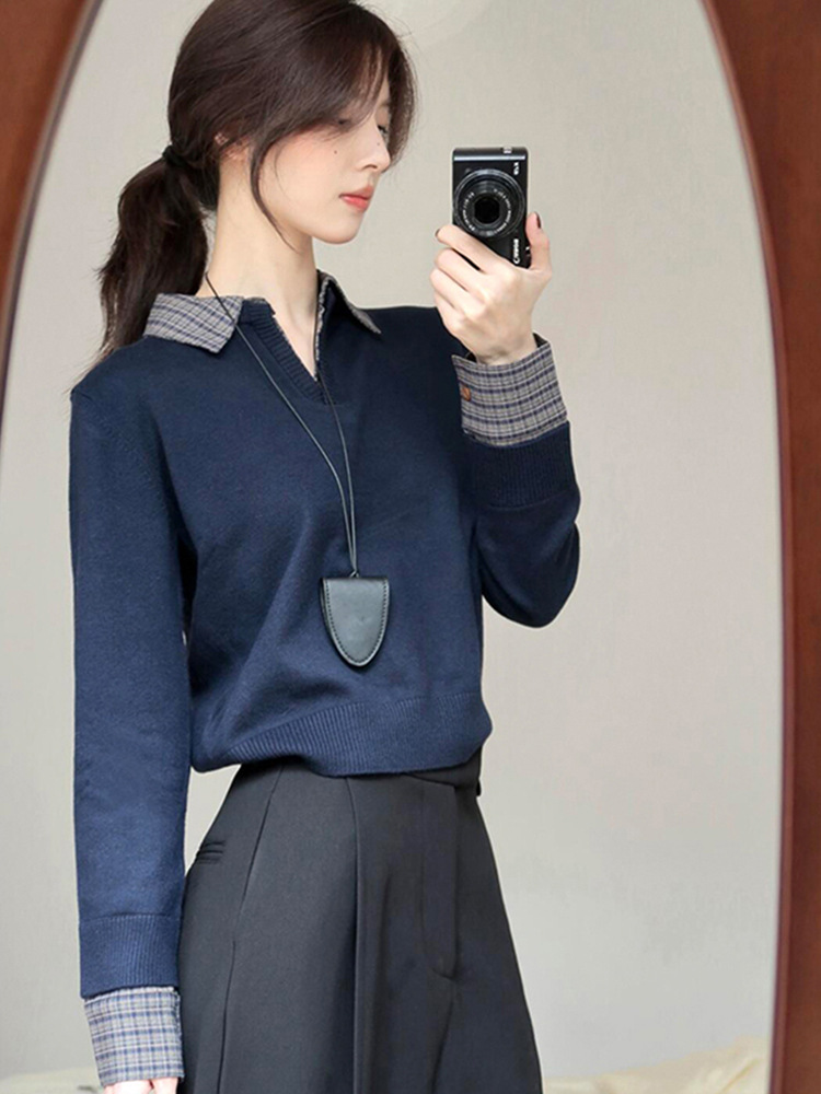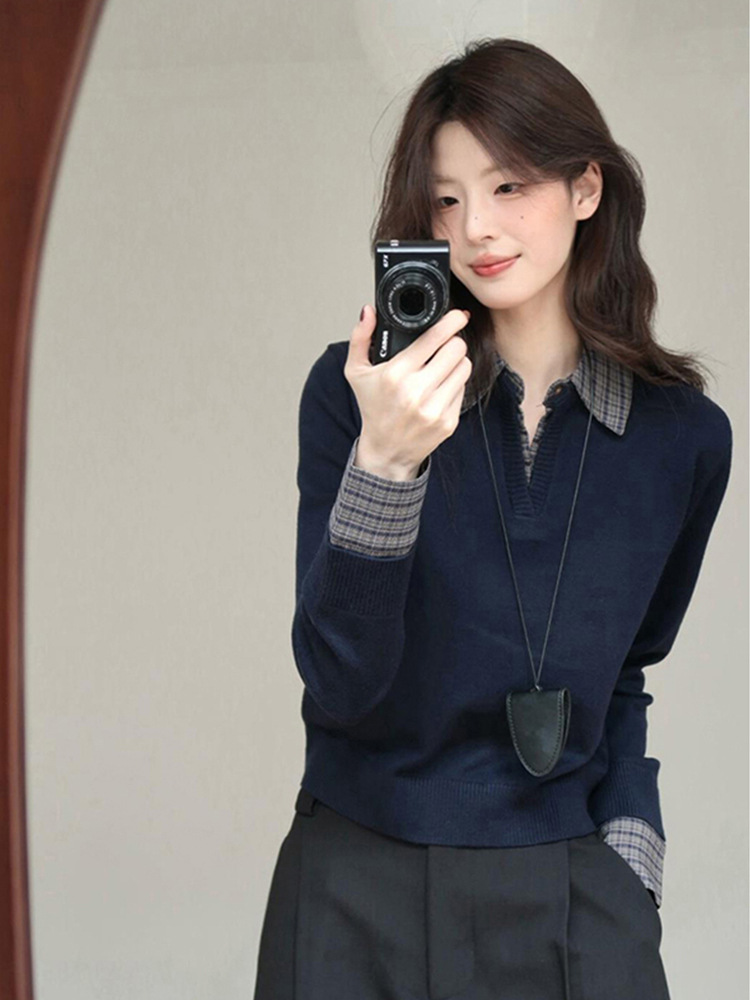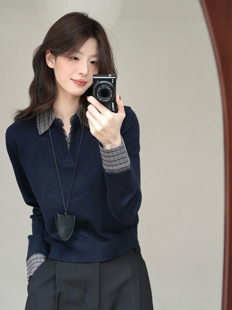 哥家商场同款女装2025秋季衬衫拼接假两件针织衫内搭韩系穿搭上衣