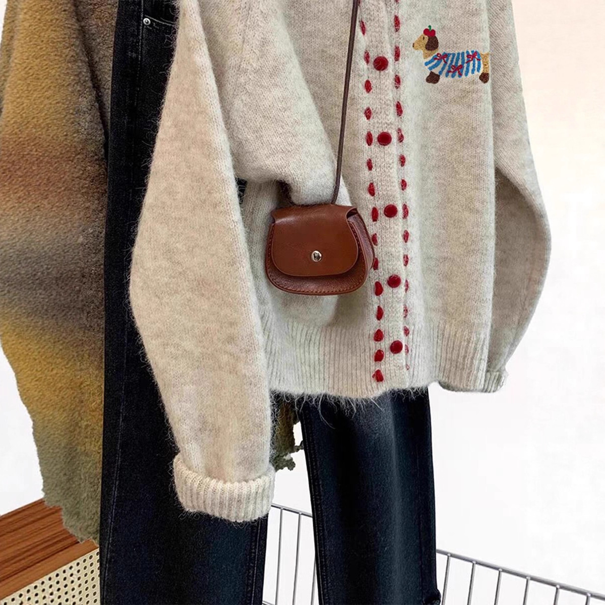 哥家商场同款女装2025秋季新款小狗加厚圆领针织开衫女设计感外穿