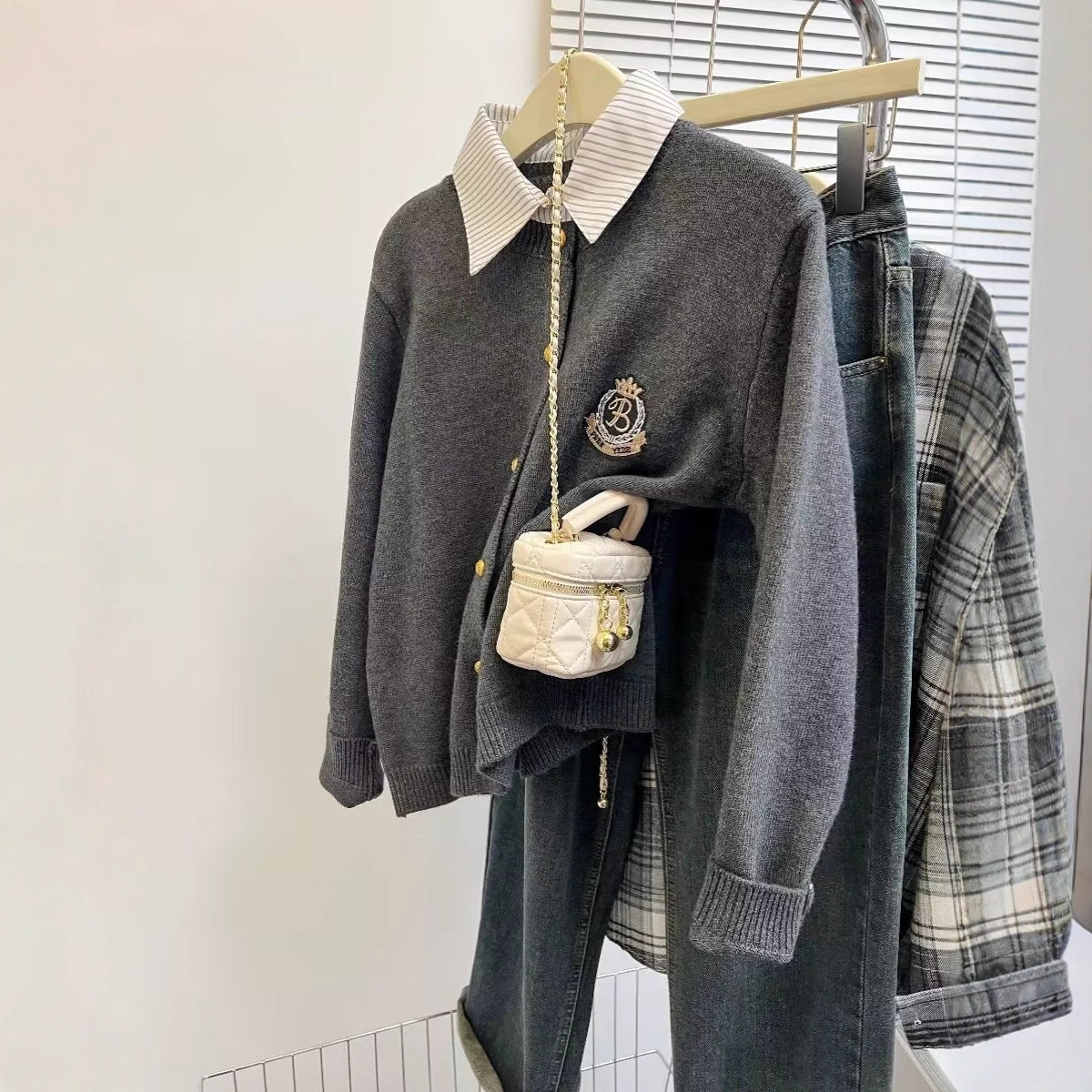 哥家商场同款女装2025秋季复古学院风假两件拼接衬衫领针织开衫