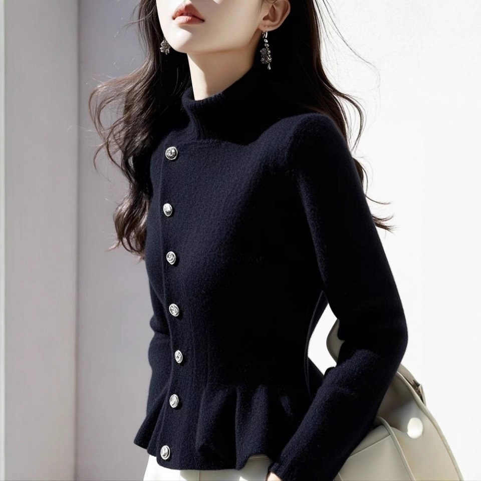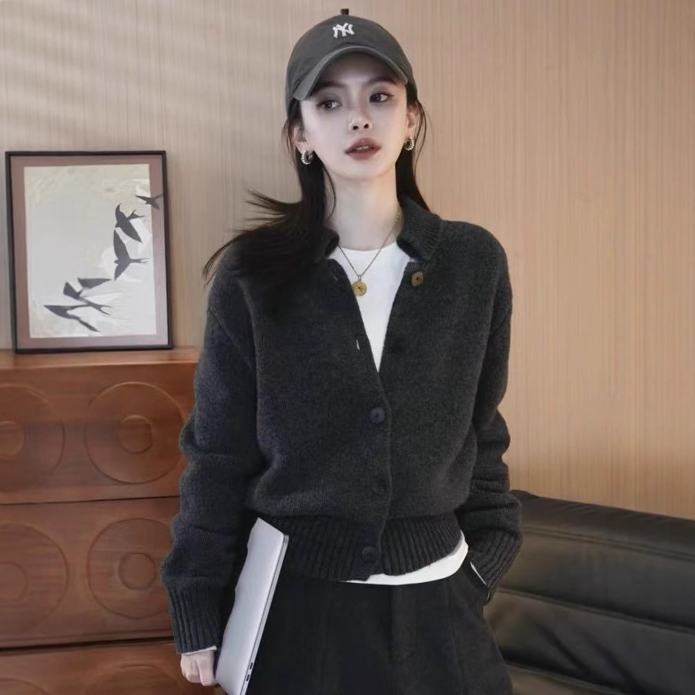 兄の家の新型婦人服2024秋冬の新しい襟の修身の気質のファスナーの純色のウールの長袖のニットのカーディガン