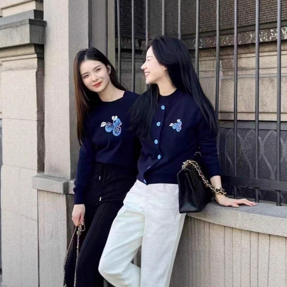 哥家商场同款女装2025秋季藏蓝色显瘦刺绣毛衣宽松羊绒针织衫外套
