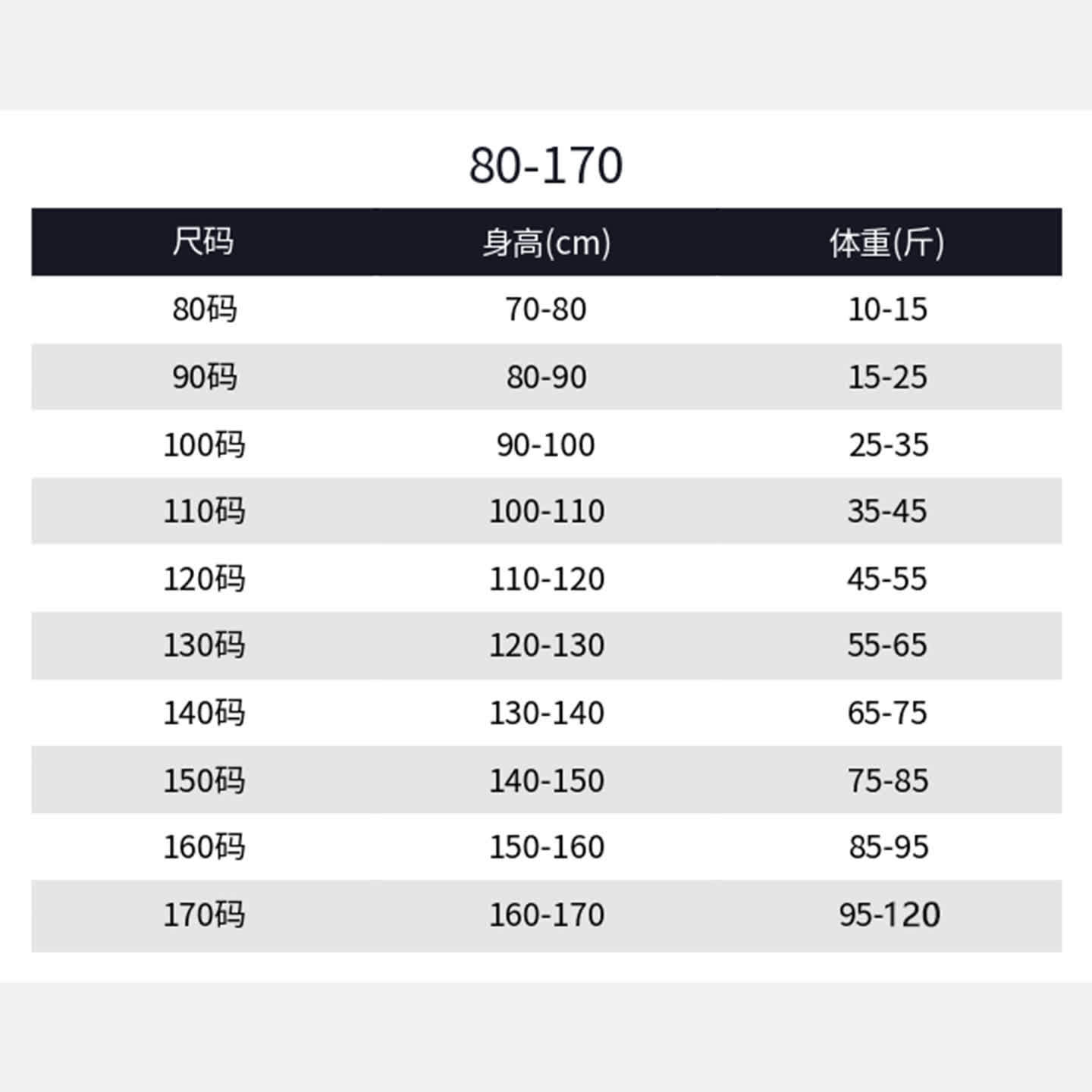 适合身高 80码身高70-80cm,90码身高80-90cm,100码身高90-100cm,110码身高100-110cm,120码身高110-120cm,130码身高120-130cm,140码身高130-140cm,150码身高140-150cm,160码身高150-160cm,170码身高160-170cm
