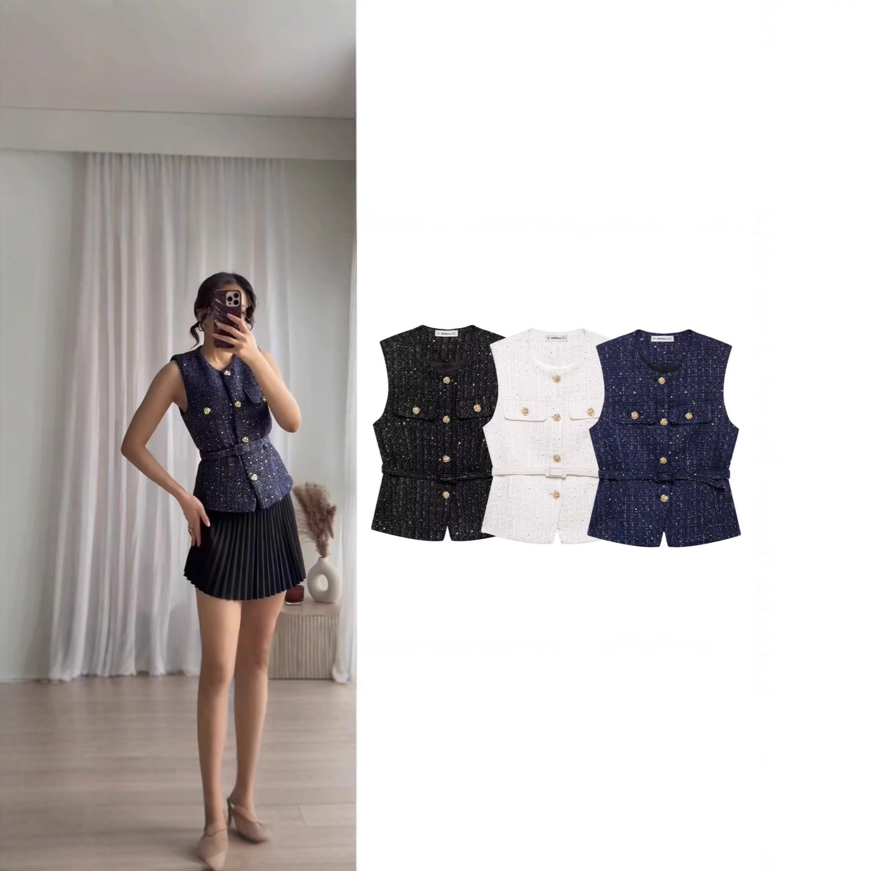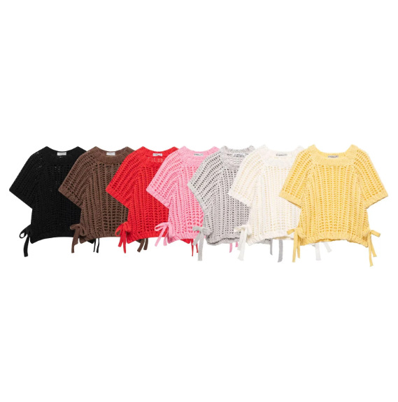 2025年春新作 欧米風万能カジュアル無地ベルト付きビーズ装飾粗織ベスト(越境貿易婦人服)