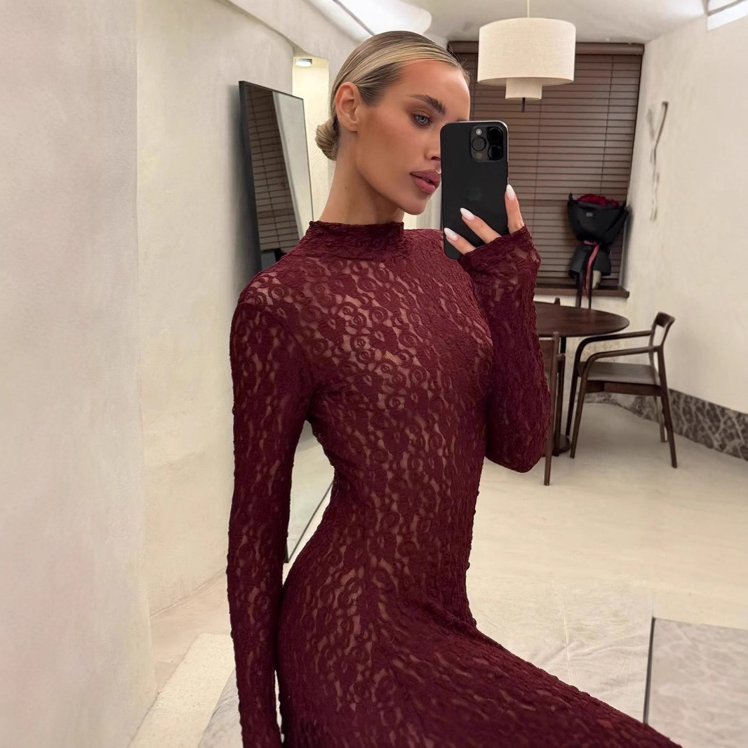 2025年春新作 欧米風 多彩な着こなしができる 上品なレース装飾 ミディ丈 長袖ワンピース (越境EC向け婦人服)