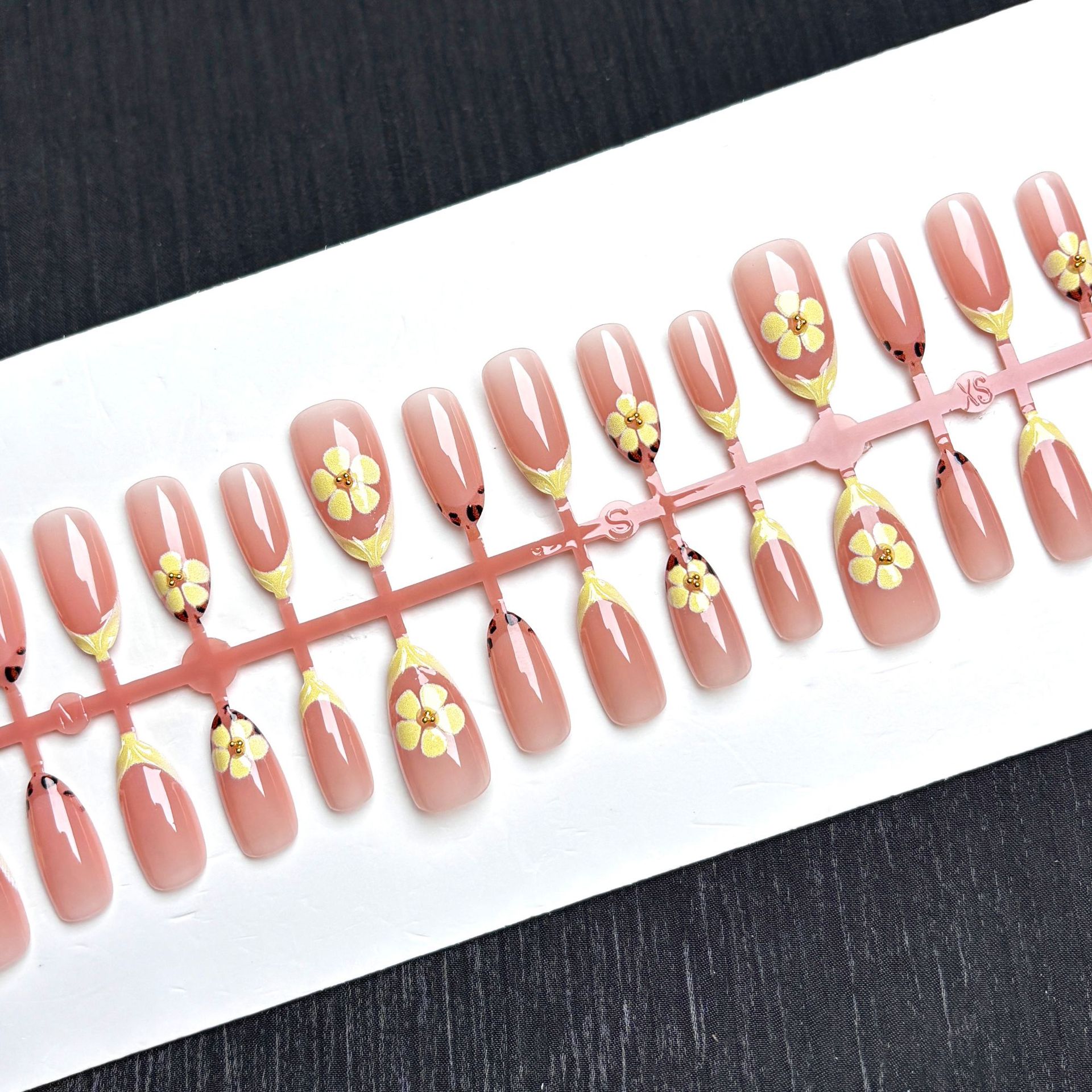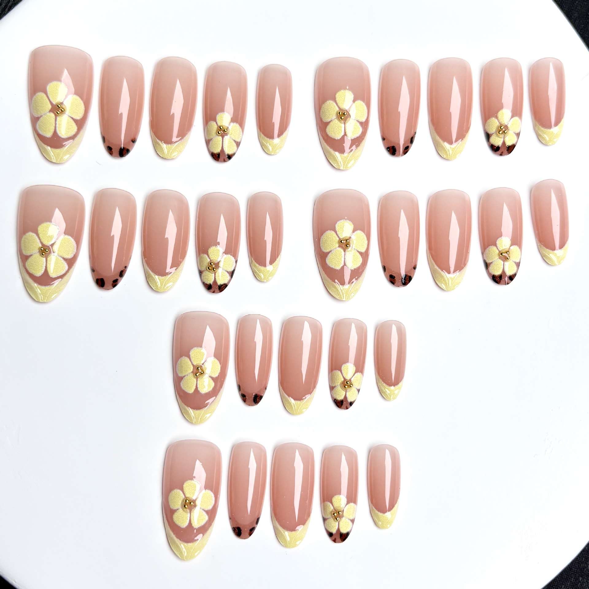 跨境爆款奶黄色花朵豹纹法式穿戴甲ins外贸美甲贴片3D可拆卸nails