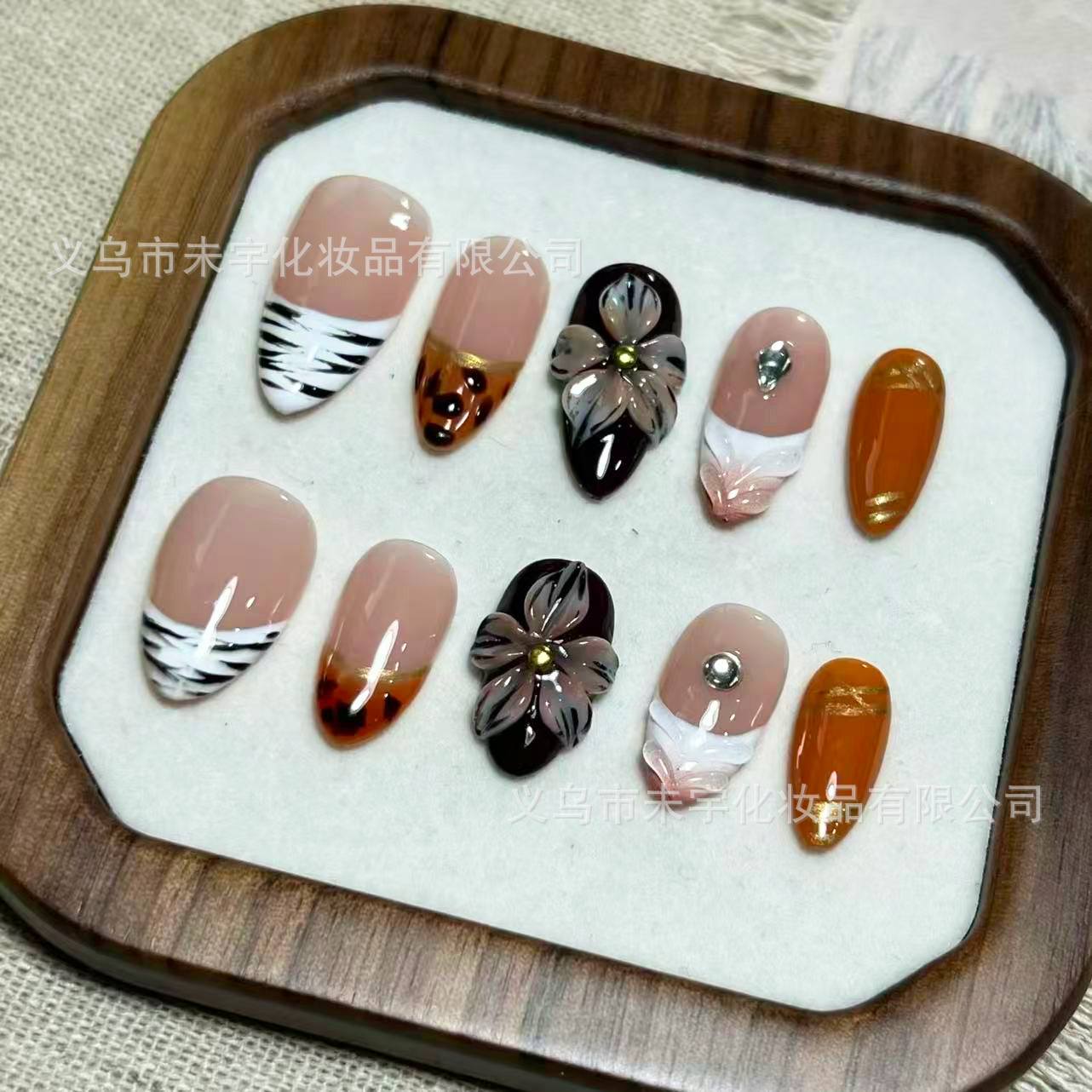跨境热销秋冬杏仁豹纹花朵鎏金穿戴甲法式斑马纹美甲贴片欧美爆款