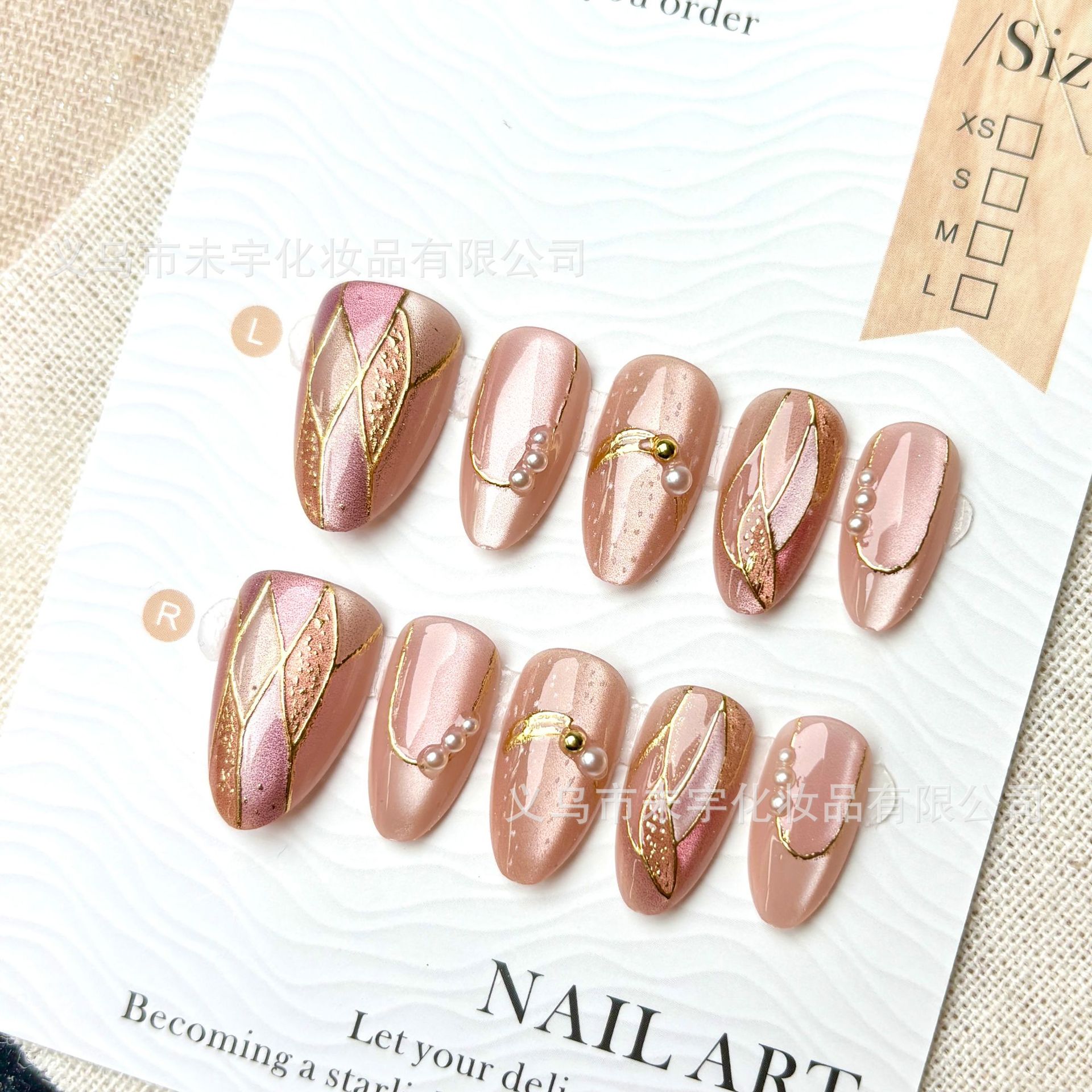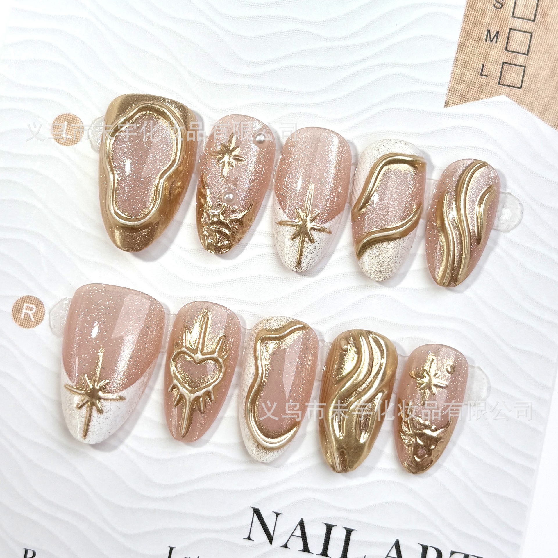 短短杏仁鎏金猫眼裸粉色穿戴甲气质优雅鎏金菱格美甲贴片ins清新