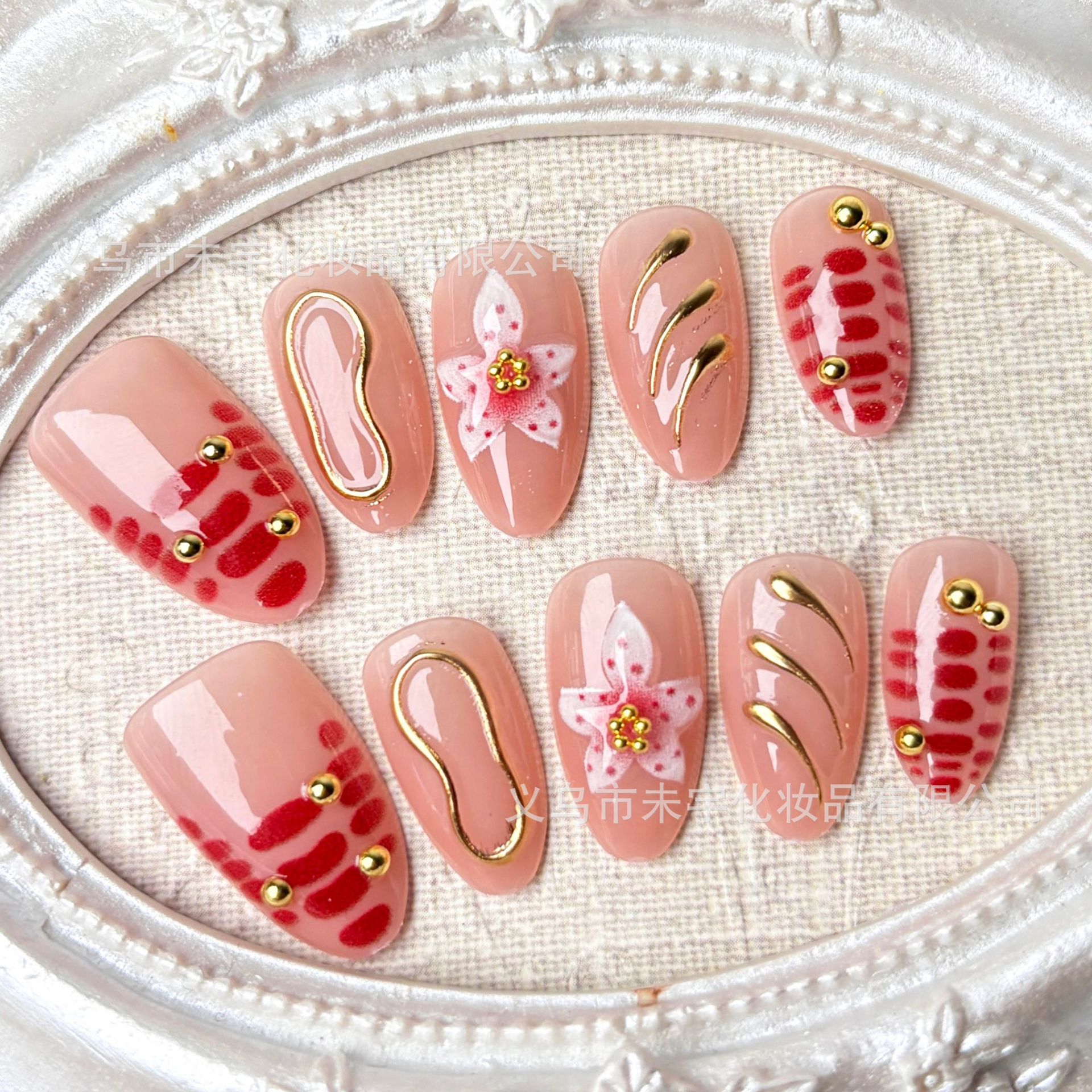 ins短短杏仁粉樱花鎏金穿戴甲温柔豹纹美甲贴片秋冬跨境欧美热销