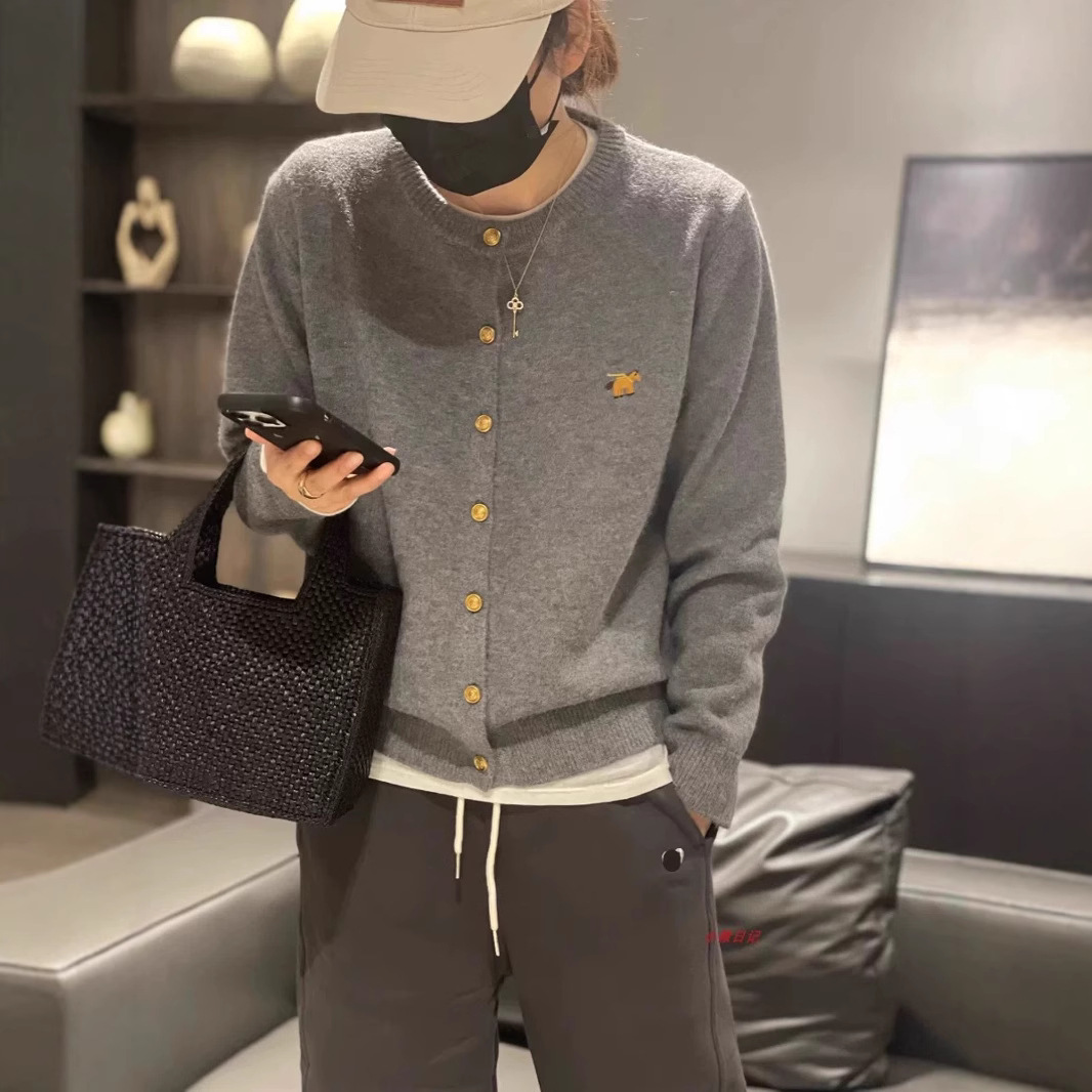 刺繍のポニーラウンドネックの金属ボタンはカジュアルで、モチモチとしたニットカーディガンです。