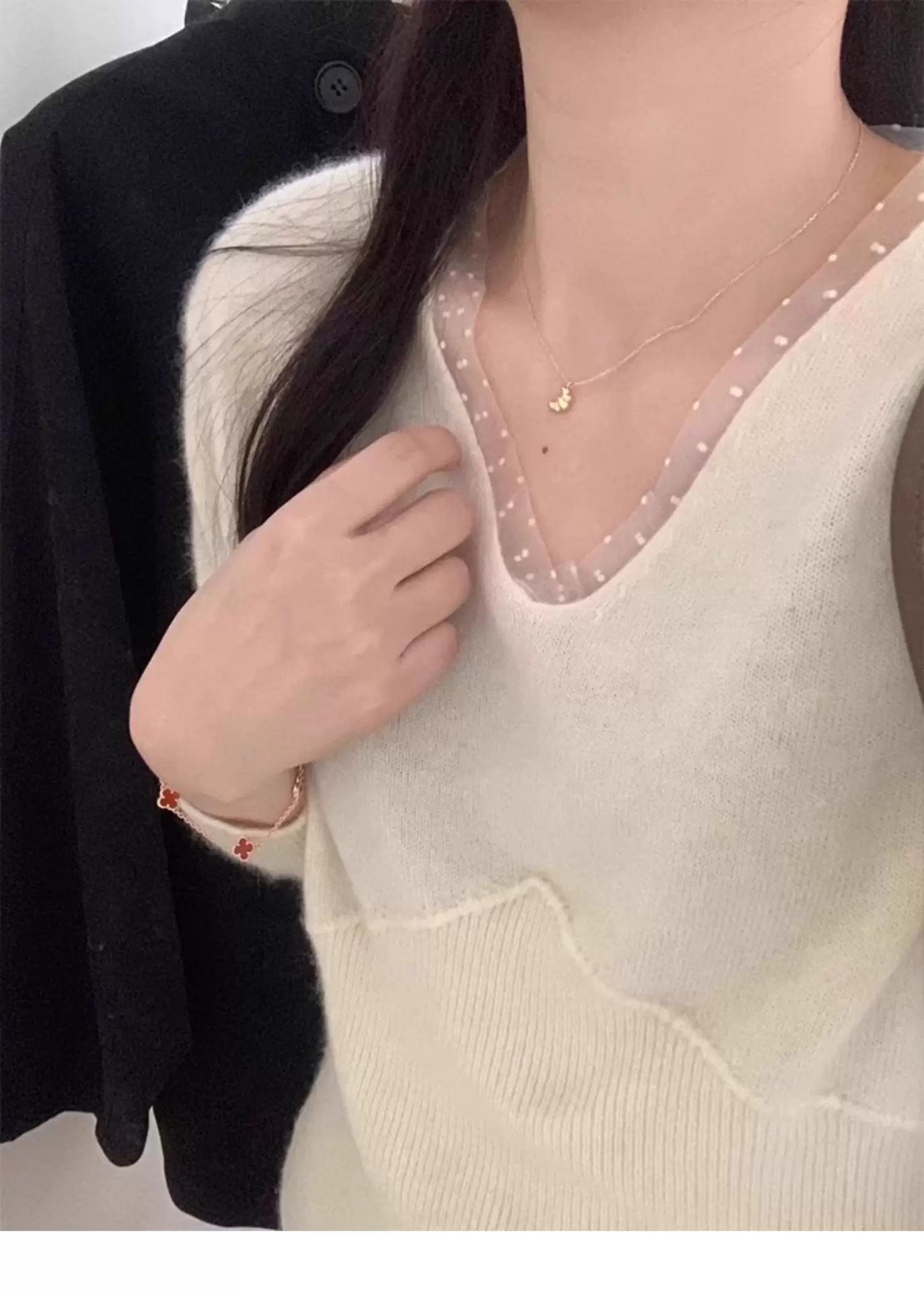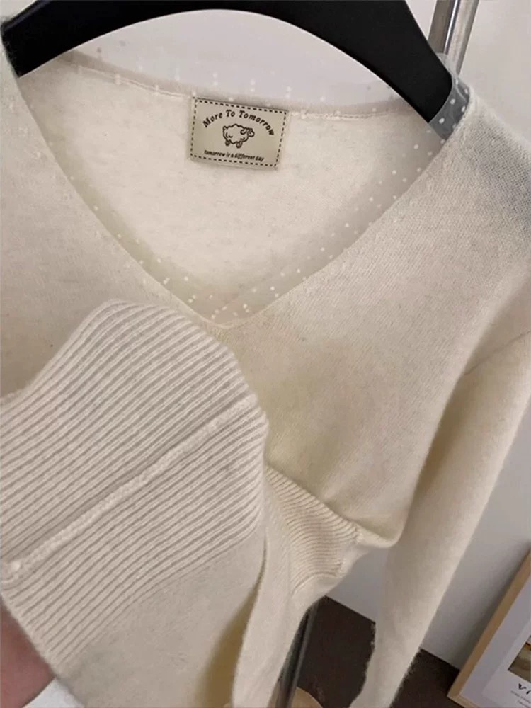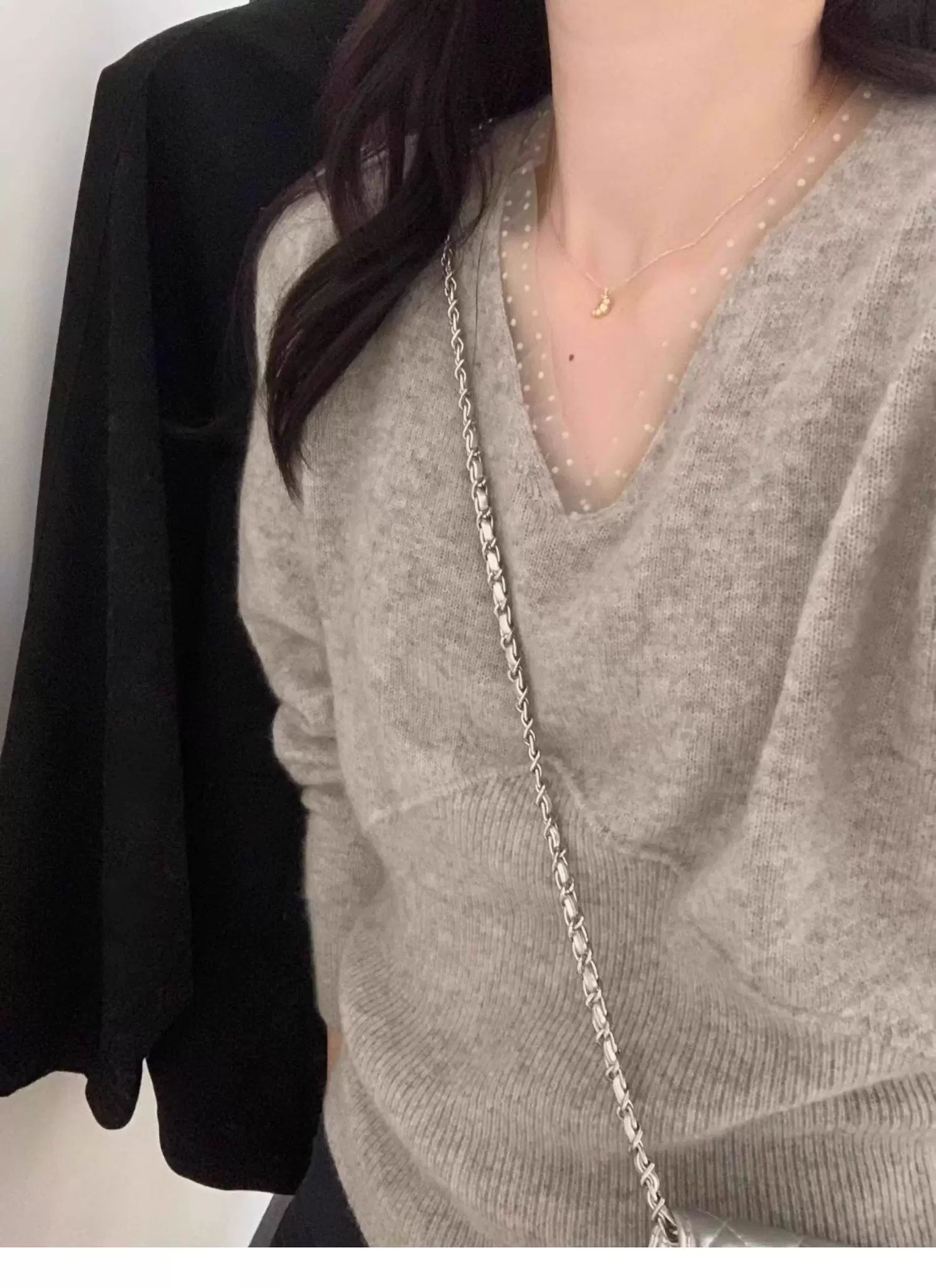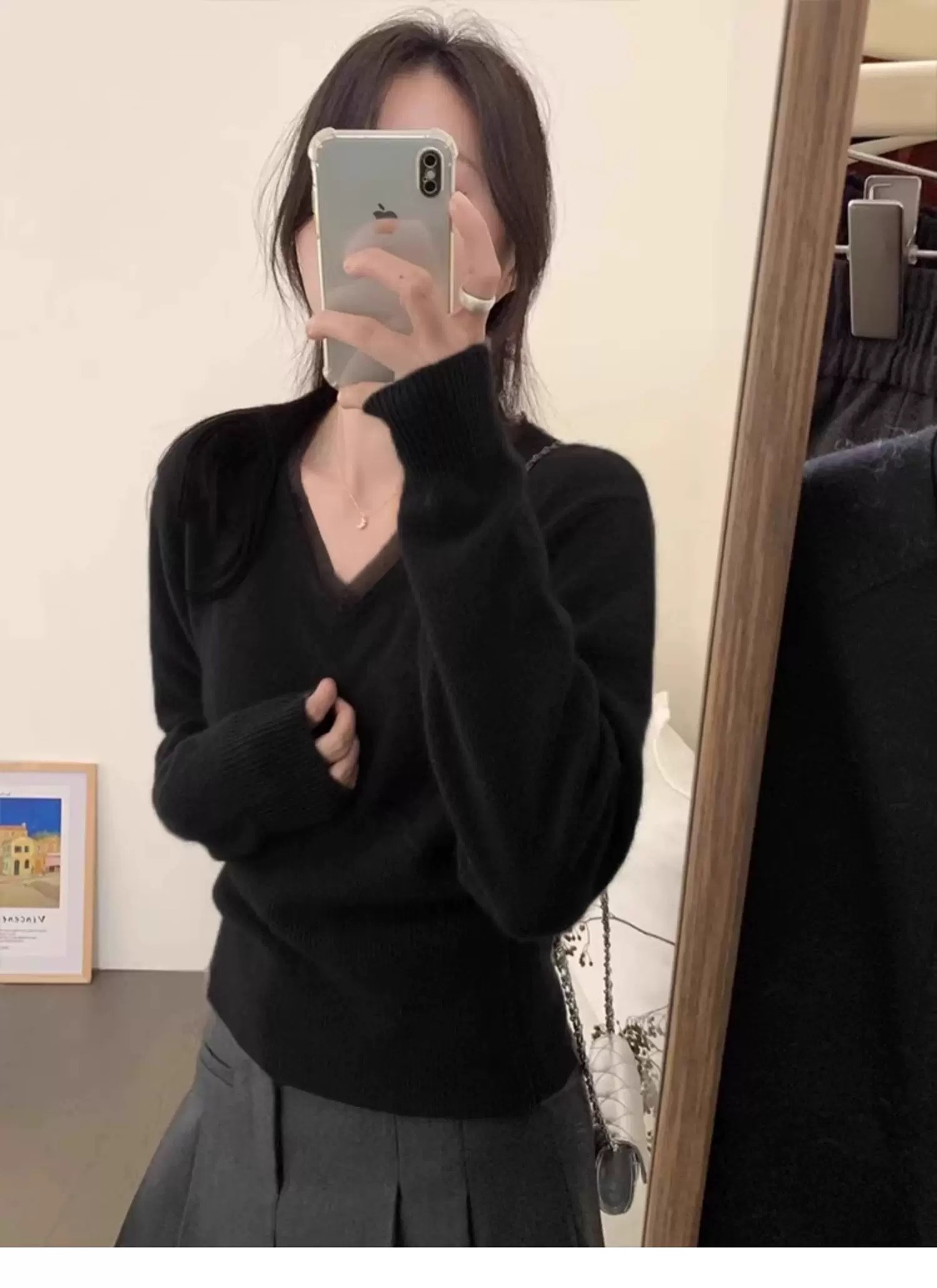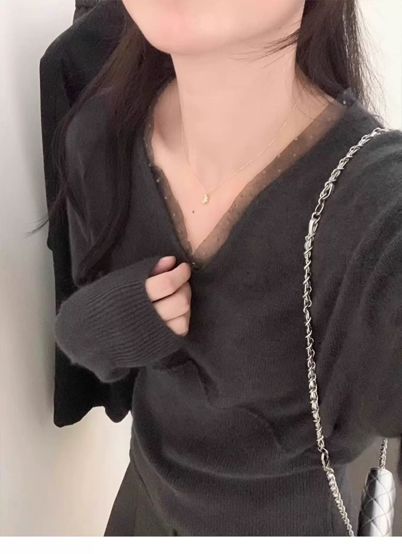 25秋冬新款女羊毛衫丝绒V领波点雷瑟花边内搭针织衫毛衣长袖上衣