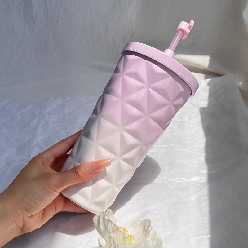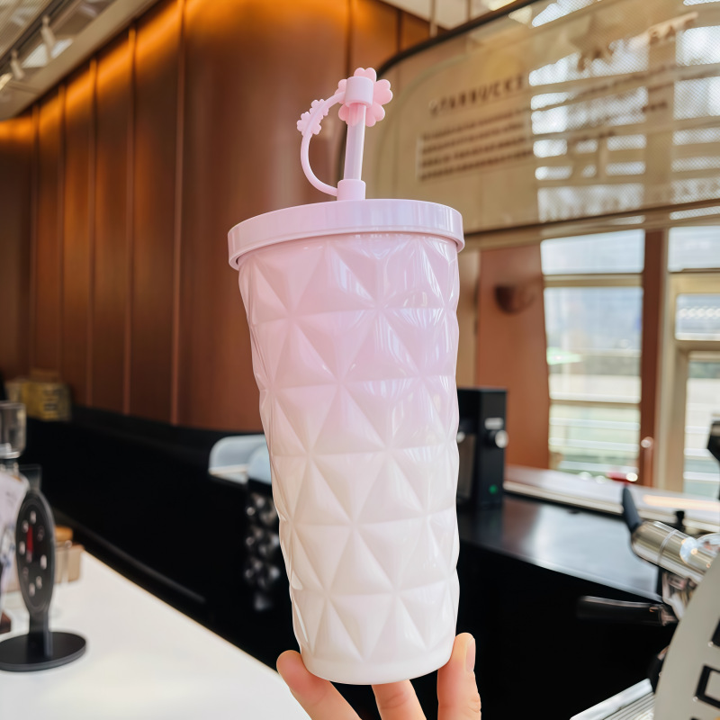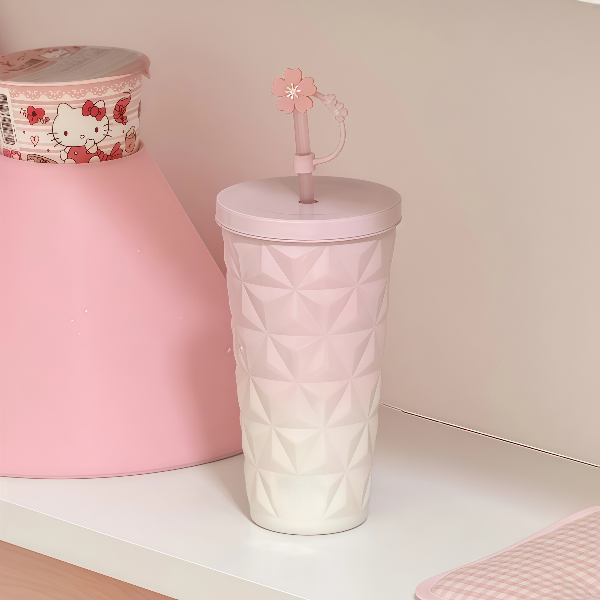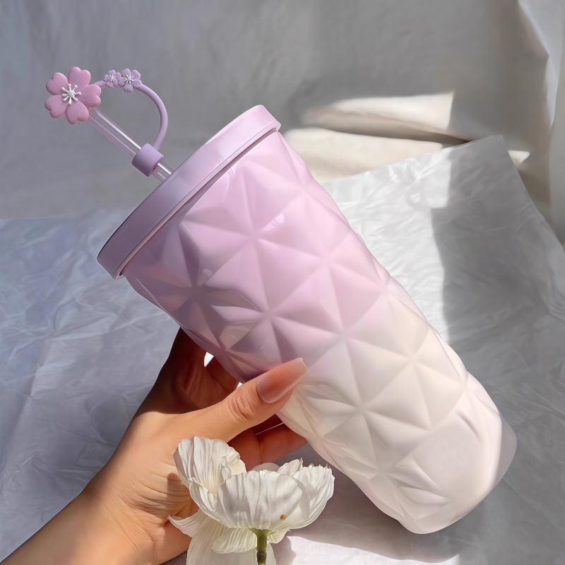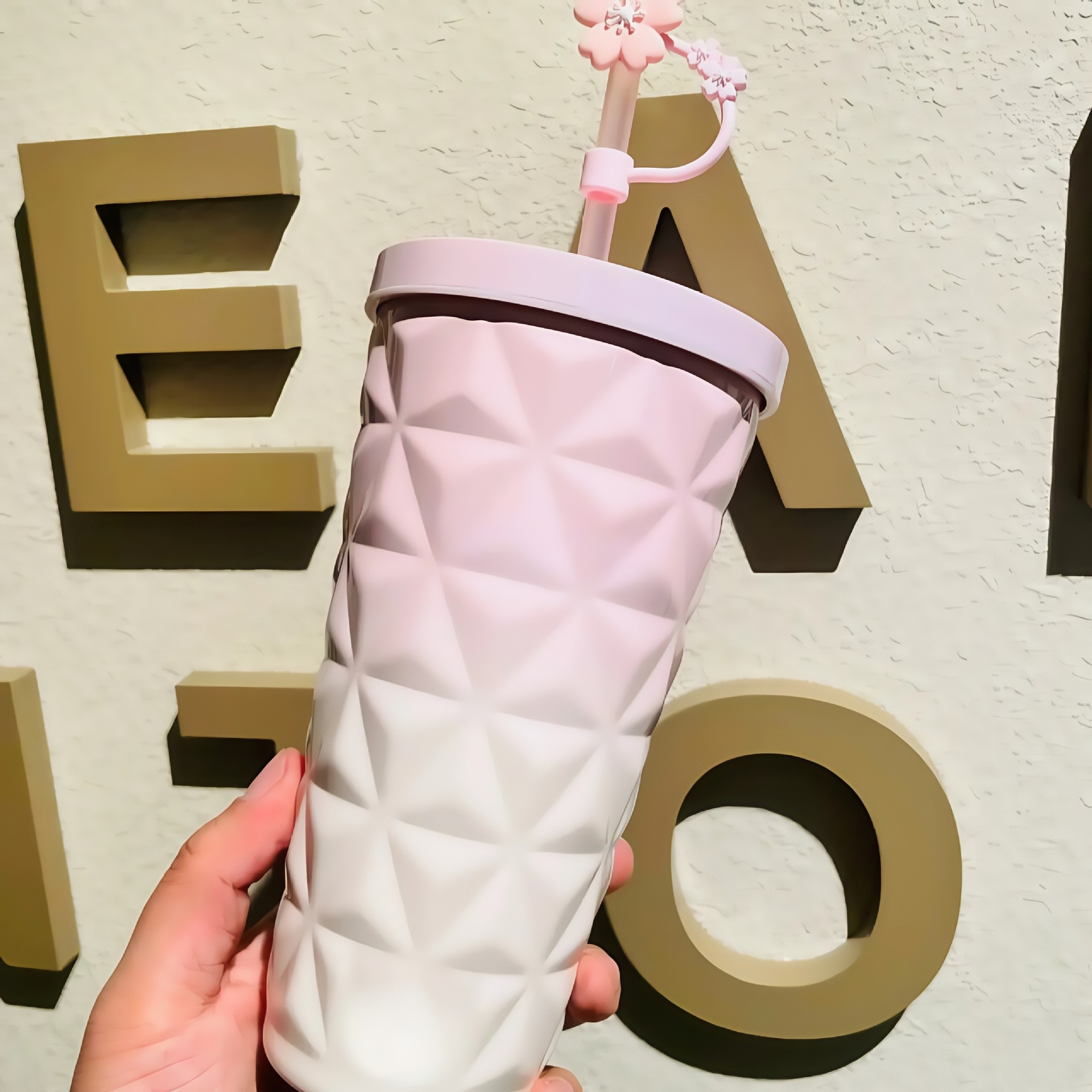 樱花渐变咖啡杯保温杯菱形吸管水杯高颜值大容量新款不锈钢男女便