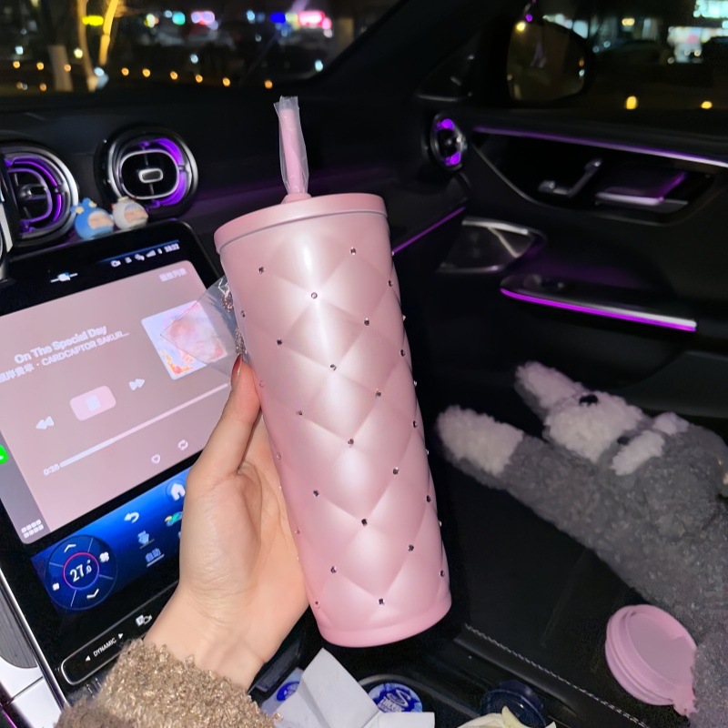 高颜值菱形镶钻吸管杯 304不锈钢保温大容量随行杯新款创意水杯